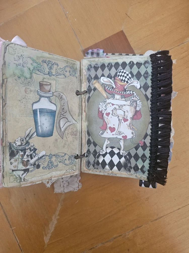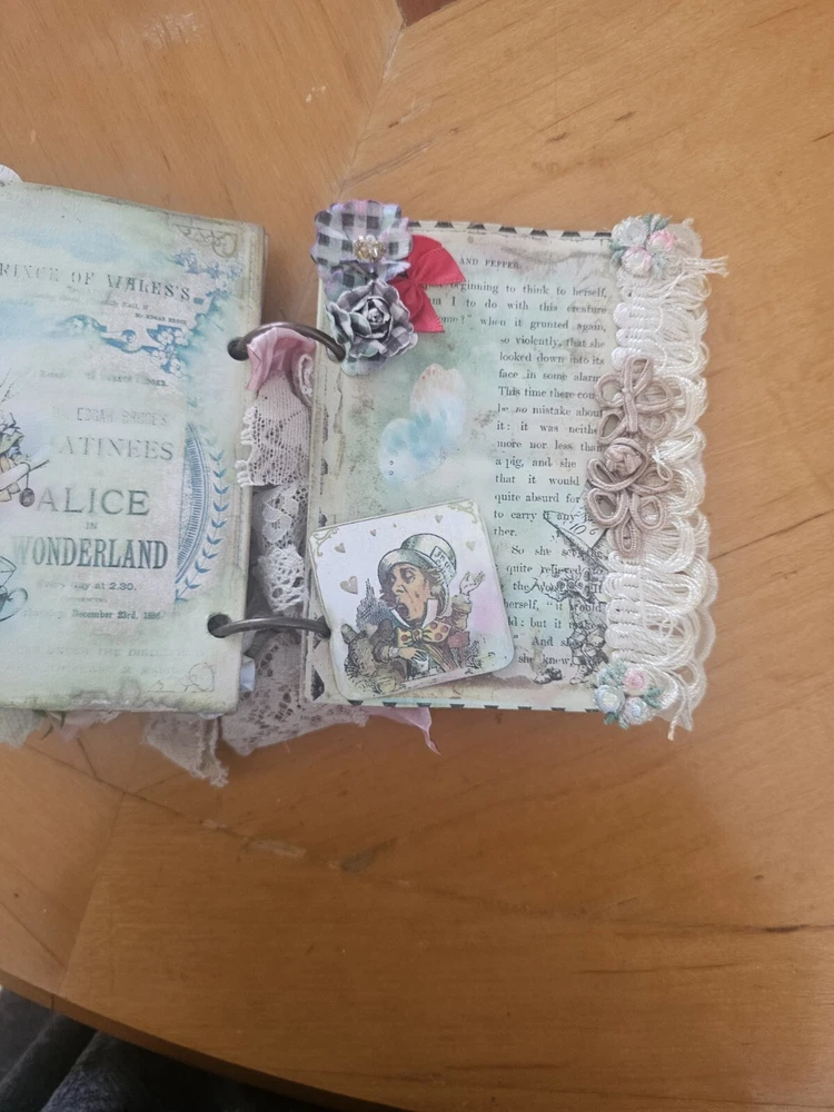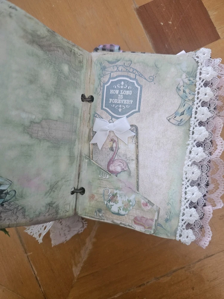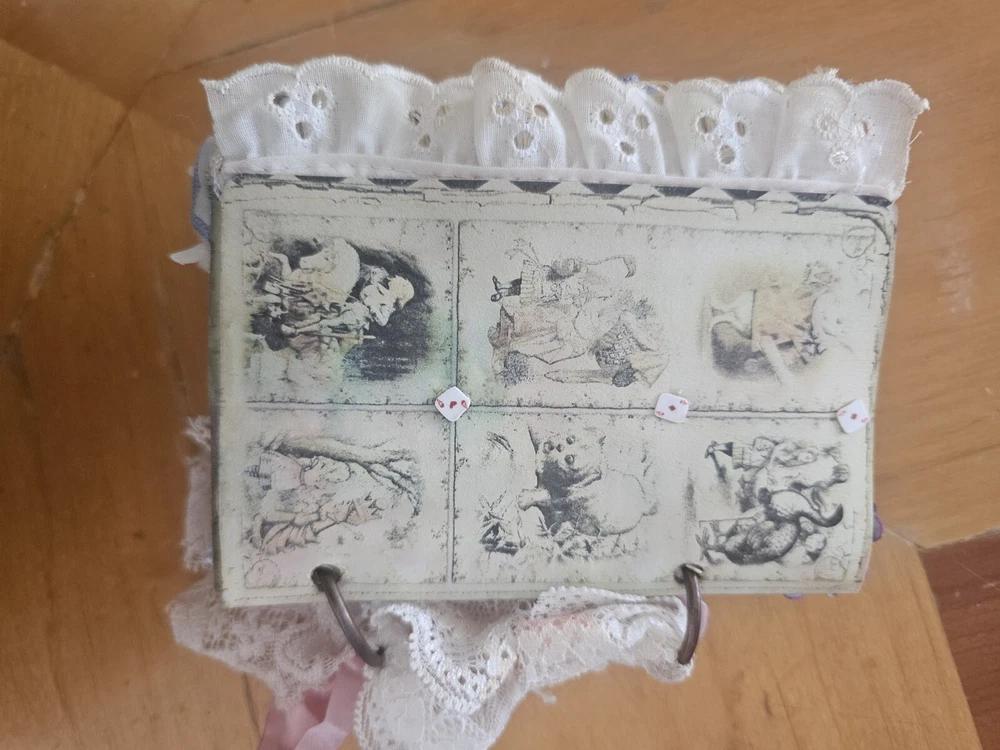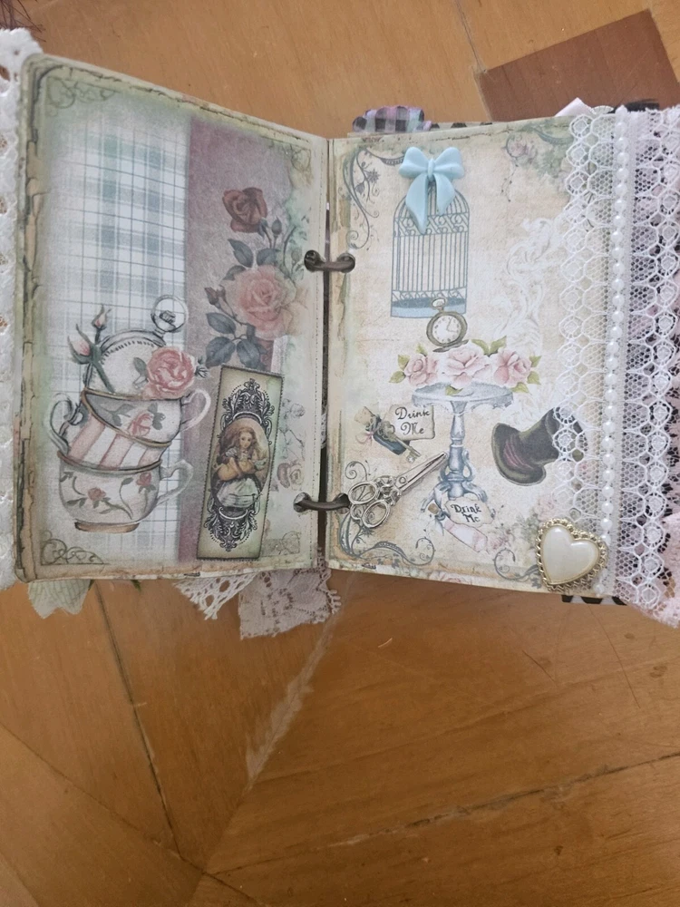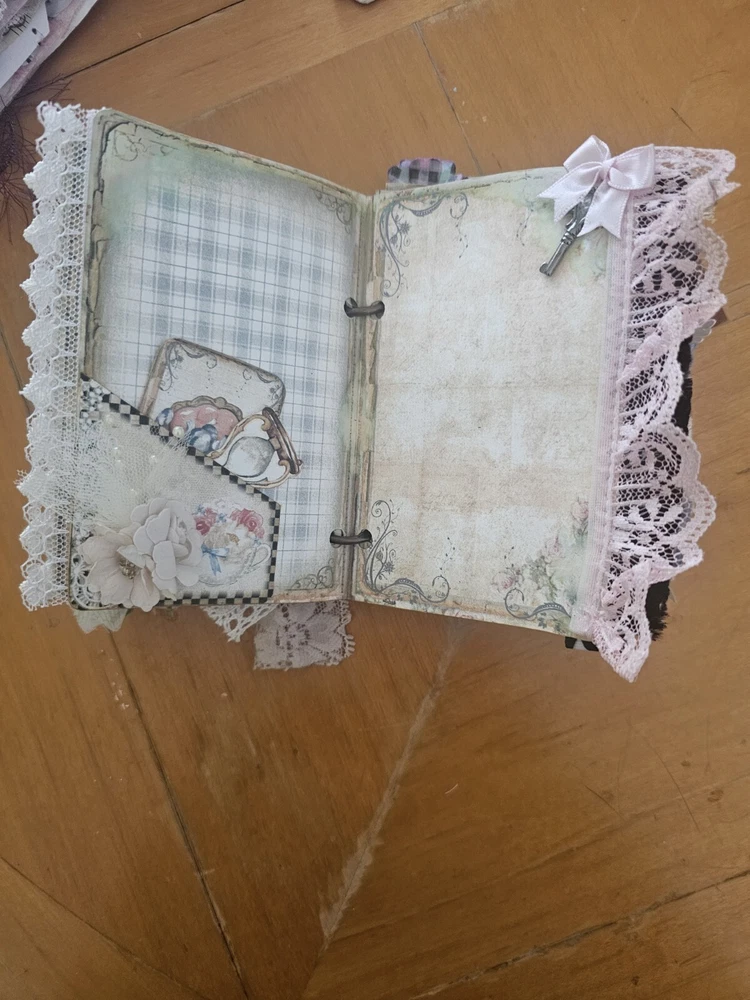 The "junk journal handmade" is a custom-made journal created using a variety of materials such as recycled paper, fabric, beads, and other embellishments. This type of journal is typically made to have a vintage, eclectic look and feel, with various textures and designs incorporated into its pages. It is perfect for those who enjoy creative journaling, scrapbooking, or keeping memories in a unique and artistic way. The handmade aspect adds a personal touch and makes each journal one-of-a-kind.