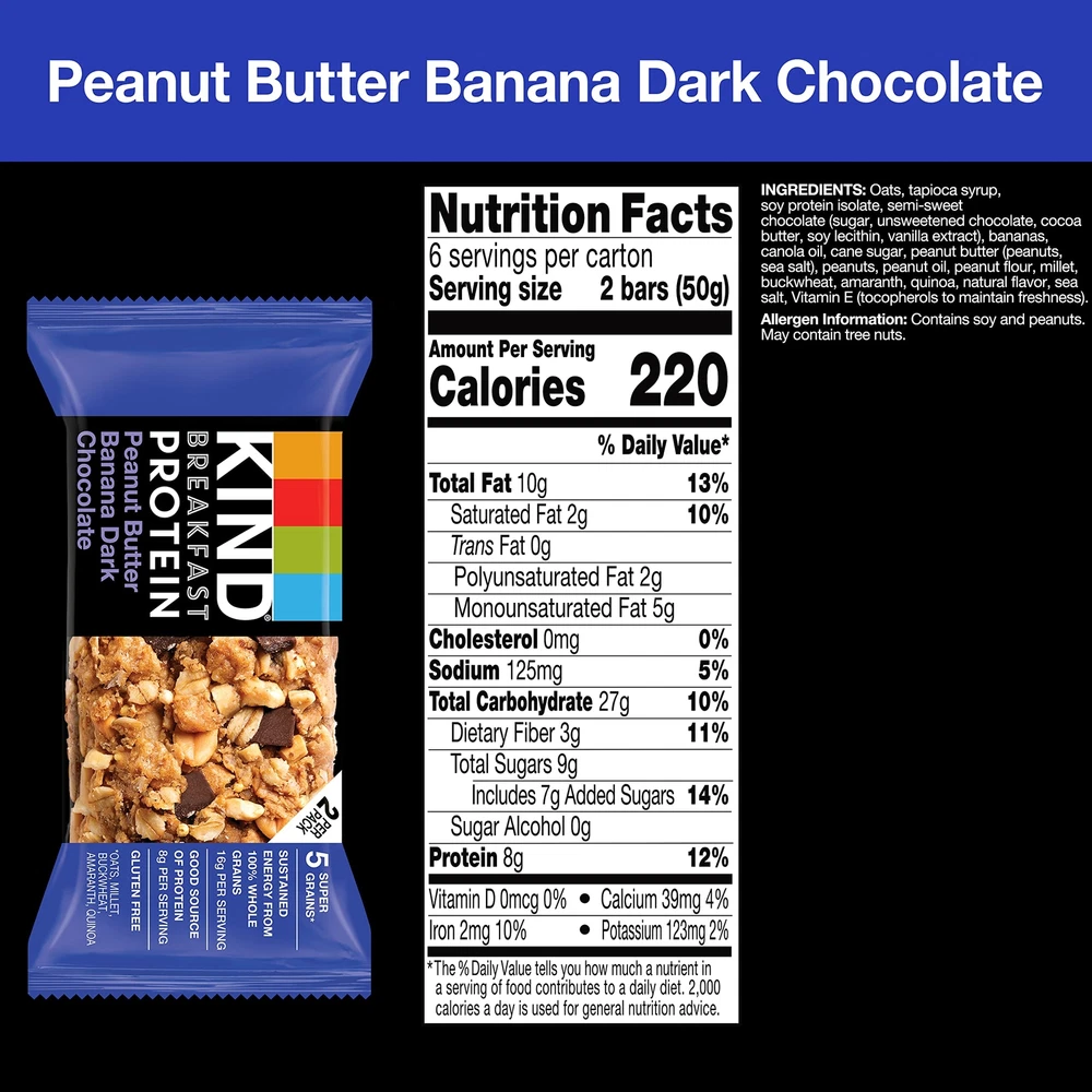 Breakfast Peanut Butter Banana Dark Chocolate protein bars are a wholesome, healthy snack made with 100% whole grains for sustained energy. Peanut Butter Banana Dark Chocolate breakfast protein bars are made with five super grains—oats, buckwheat, millet, amaranth and quinoa—and baked with the taste of dark chocolate, banana and peanut butter for a chewy, soft baked addition to your breakfast. These bars come in individually wrapped two bar packs that are perfect for convenient, on-the-go gluten free snacks. Each two bar pack has at least one full serving of whole grains. Breakfast protein bars help provide sustained energy whether you need a nutritious snack for your lunchbox or nutrition bars to grab on your way out the door. Made with quality, wholesome ingredients, these gluten free breakfast bars contain 16 grams of whole grains per serving. These healthy snacks are also dairy free and made without genetically engineered ingredients. Five boxes of six 1.76 oz two-bar packs of Breakfast Protein, Healthy Snack Bar, Peanut Butter Dark Chocolate breakfast bars Gluten free bars made with five super grains - oats, buckwheat, millet, amaranth and quinoa Low sodium snacks made with peanut butter, banana and the taste of dark chocolate for a delicious flavor gluten free protein bars are convenient, individually wrapped snacks for a great addition to any breakfast Kosher snacks made without genetically engineered ingredients, and contain 16 grams of whole grains and 8 grams of protein per serving Nutrition bars that make eating healthy easier