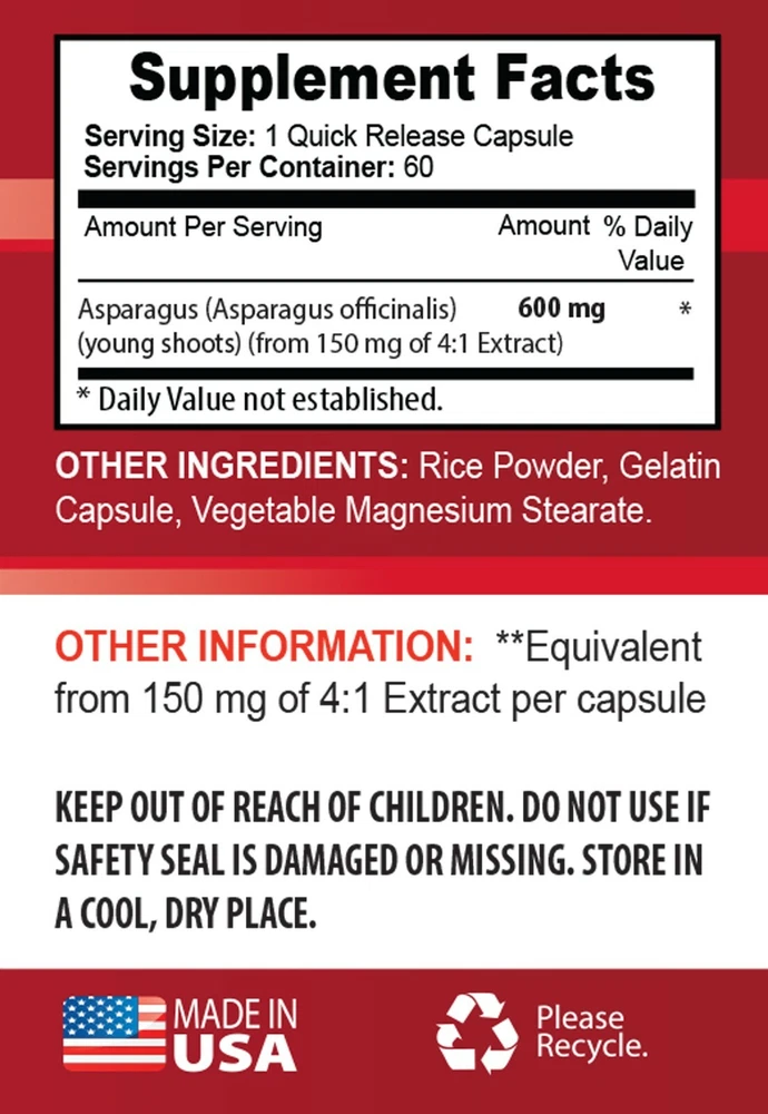 Asparagus Young Shoots 600mg 4:1 Extract -Made in the United States- (2 Bottles, 120 Capsules) Product Description: Asparagus extract is a natural remedy available in dietary supplement form. Typically sourced from the spears, root, and stems of the asparagus plant, it's used in alternative medicine for a variety of health problems. Since asparagus extract is said to increase the flow of urine, proponents claim it can help treat conditions affecting the urinary tract. In alternative medicine, asparagus is touted as a natural treatment for the following health conditions: Chronic fatigue syndrome Constipation Diabetes Hangovers High blood pressure High cholesterol Insulin resistance Kidney stones Liver disease Urinary tract infections In addition, asparagus extract is said to promote detox, stimulate hair growth, increase libido, and treat hormone imbalances in women. BENEFITS OF ASPARAGUS EXTRACT: Improves Fertility. The root of asparagus racemosus is widely appreciated in Ayurvedic therapy and is famously known as Shatavari, which means 'one who has 100 husbands'. Shatavari has aphrodisiac properties and is used to regulate the hormones and cure male and female sexual disorders. It has anti- properties and helps in curing physical and mental debility in males. It also helps in enhancing the libido and boosts sperm count and its motility. In females, asparagus has been proven to be effective in menopausal syndrome and anemia. Eye Care. Asparagus is a good source of vitamin A, which is essential for healthy vision. Due to the presence of antioxidants, it helps in defending the retina from the damage caused by the oxygen-free radicals. The presence of the amino acid glutathione in it also helps in reducing the risk of eye ailments such as cataracts and night blindness. Improves Digestion. Asparagus contains significant quantities of the nutrient inulin, which is a kind of complex carbohydrate, commonly known as prebiotic. It does not get digested until it reaches the large intestine, where it is fed upon by a kind of good bacteria like lactobacilli. Inulin aids in the improved absorption of nutrients and the reduced risk of stomach diseases. High Cholesterol. A number of studies indicate that asparagus extract may help reduce levels of harmful blood fats that contribute to heart disease, such as LDL ("bad") cholesterol. In a study published in Phytotherapy Research in 2011, for example, researchers gave asparagus extract to a group of mice on a high-fat diet. After eight weeks of treatment, the mice showed a significant decrease in total cholesterol and LDL cholesterol, as well as an increase in HDL ("good") cholesterol. Supplement Facts Serving Size: 1 Quick Release Capsule Servings per Container: 60 Asparagus (Asparagus officinalis) - 600mg (young shoots)(from 150mg of 4:1 Extract) OTHER INGREDIENTS: Rice Powder, Gelatin(Bovine), Vegetable Magnesium Stearate. WARNING: KEEP OUT OF REACH OF CHILDREN. DO NOT USE IF SAFETY SEAL IS DAMAGED OR MISSING. STORE IN A COOL, DRY PLACE. *These statements have not been evaluated by the FDA. This product is not intended to diagnose, cure, treat, or prevent any disease. PREMIUM QUALITY PRODUCT