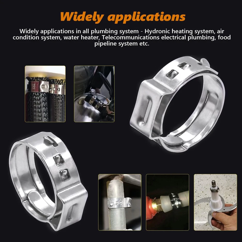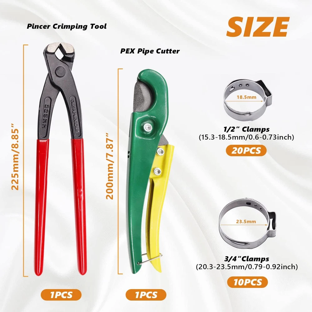 mankk PEX Pipe Clamp Cinch Tool Ear Kit, Pex Kit Product Details Brand: mankk Material: Stainless Steel Color: Pex Clamp Tool Kit Handle Material: Stainless,Stainless Steel,Steel Item Weight: 0.06 Kilograms Specific Uses For Product: Crimping,Cutter,Electrical,Plumbing Grip Type: Ergonomic Cutting Width: 32 Millimeters Manufacturer: mankk Part Number: M-118 Item Weight: 2.08 ounces Package Dimensions: 9.92 x 3.98 x 1.97 inches Country of Origin: China Size: PEX Clamp Tool Kit Item Package Quantity: 1 Batteries Included?: No Batteries Required?: No Brand: mankk Material: Stainless Steel Color: Pex Clamp Tool Kit Handle Material: Stainless,Stainless Steel,Steel Item Weight: 0.06 Kilograms Specific Uses For Product: Crimping,Cutter,Electrical,Plumbing Grip Type: Ergonomic Cutting Width: 32 Millimeters PEX Pipe Cinch Tool Set ,Includes: Ear clamp pliers crimp tool, pipe cutter, 20pcs 1/2" and 10 pcs 3/4" 304 Stainless Steel Clamps. The matching pincer crimping tool can not only be used to clamp the ear hose clamp, but also be used as a nail puller or to cut steel wire and iron wire.PEX pipe cutter can quickly and easily cut pipes with a diameter less than 32 mm into required dimensions,meet your various needs. Single ear hose clamp is made of 304 stainless steel, which is corrosion-resistant and rust-proof, and can be used in complex environments.Ear clamp is made of high-strength chrome vanadium steel, which is strong and can be used for a long time. It has a non-slip handle for your convenience. Widely applications in all plumbing system - Hydronic heating system, air condition system, water heater, Telecommunications electrical plumbing, food pipeline system etc. Providing a strong and reliable crimp fitting application. Easy Installation:Slide PEX cinch clamp ring over the pipe, push the pipe onto the fitting and squeeze with your clamp tool. Providing a strong, leak-free and reliable crimp fitting connection.