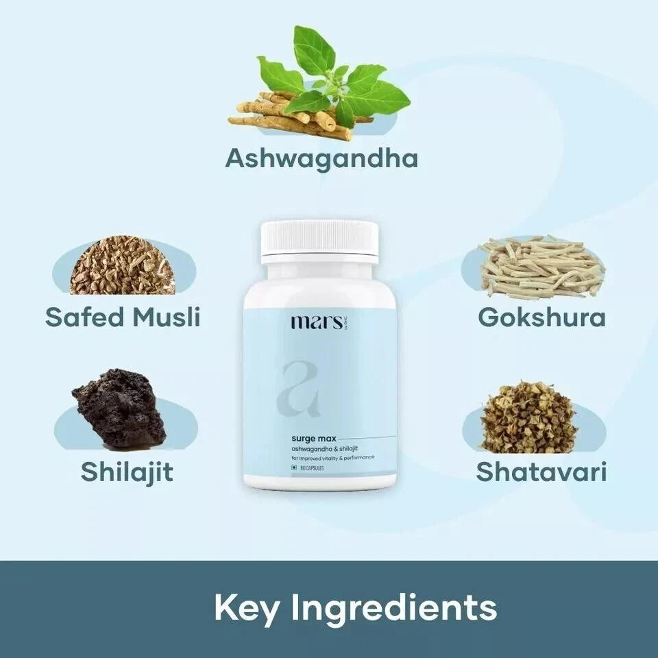 mars by GHC surgemax natural ashwagandha caps, with shilajit(60N), (Pack of 1)