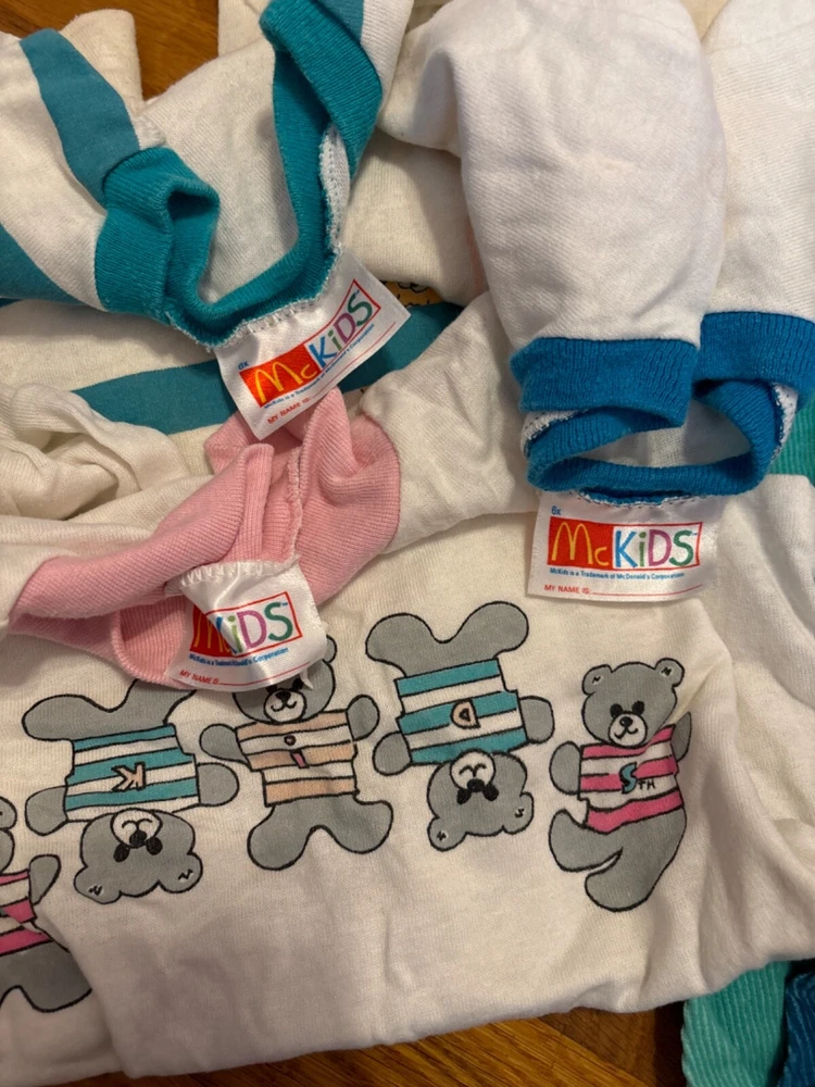 This lot includes a 90s outfit set for girls, all in size six. The brand is McDonald's and the character is Mcdonalds. The set is perfect for any young fan of the fast-food chain and includes all the necessary items for a complete look. The style is 90s, adding a fun touch to the outfit. This set is great for babies and toddlers who love to dress up and stand out.