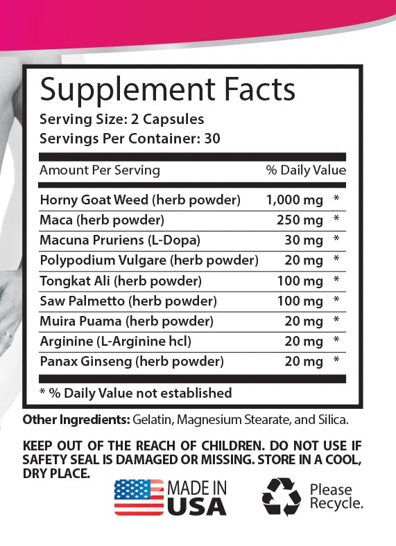 FEMALE ENHANCEMENT Promote Healthy Sexual Vitality Made in USA 2 Bottles 120 Capsules Female Enhancement includes the most popular natural aphrodisiac herbs : Horny Goat Weed, Maca, Mucuna Pruriens, Polypodium Vulgare, Tongkat Ali, Saw Palmetto, Muira Puama, Panax Ginseng. What Is Horny Goat Weed? Horny goat weed is a herb known as a “natural aphrodisiac,” wich may have positive effects on libido. The plant that produces horny goat weed is called Epimedium. Epimedium contains active ingredient called icariin, which is responsible for most of it’s health-promoting effects for help with libido and bone health. It has the following benefits: -Helps to increase testosterone production -Helps to increase estrogen levels, particularly in post-menopausal women -Improving libido -Boosting circulation -Normalizing cortisol levels -Helps to increase lean muscle mass Maca and Fertility : Maca is actually an adaptogen, which is a substance such as a food or an herb that adapts to conditions within the body in order to restore health. Several scientific studies have shown that black maca, a specific variety of the vegetable, showed that women who supplemented with maca were better able to conceive than women who did not supplement. Reducing Stress : Another outstanding benefit of Maca is its ability to balance moods. Since maca adapts to the endocrine system, it also helps to control the release of key chemicals affecting the mood such as serotonin and dopamine. Healthy levels of these substances correlate to less stress, and this reduction in stress has a direct impact on fertility. Improves Libido : A healthy libido is important for fertility. Maca increases both male and female libidos, and when a couple has a naturally higher sex drive, they focus less on pregnancy and more on each other. Tongkat Ali as Energy booster : Tongkat Ali works as Energy booster for female. Many women have problems with low energy levels. As a result they feel weak and have less energy during the day. By taking Tongkat Ali women can raise their energy levels back to normal and they will feel a great boost of energy. Tongkat Ali as natural libido support : Women can increase their libido when taking Tongkat Ali. Especially for women who are in their 30s and 40s it can greatly benefit. Tongkat Ali to control weight : Women can control their weight by taking Tongkat Ali. Tongkat Ali can stabilize the balance levels which plays an important role in weight control. If your balance levels are out of normal it can make you eating more than you actually want or need. Tongkat Ali will help to bring the balance level back to normal. Mood support : If your energy levels are down, most likely your mood will follow. This can lead to depression and lesser activity. Tongkat Ali keeps your testosterone levels on a high level, therefore you can benefit from better mood. Promotes skeletal health : Low testosterone levels are a major reason to develop bone problems which can lead to weak and fragile bones. Tongkat Ali with its characteristics to increase your energy levels can contribute to maintaining and improving superior bone health. Ginseng is now used quite extensively as an active ingredient in many beauty products, such as face creams, due to the possibilities of its anti-aging benefits. The benefits of adaptogens plus the estrogenic properties are thought to be highly effective in combating nearly all of the symptoms of menopause, including re-stimulating libido which often falls rapidly at this time. Ginseng isn’t only useful for menopausal women however. It is also used to assist younger women who suffer with painful periods. Traditionally, ginseng was also thought to ease the pain of childbirth. Another area in which studies are ongoing is that of ginseng’s beneficial effect on bone density. Post-menopausal women are very prone to changes in bone density which leads to a greater risk of fractures and injury. The Benefits of Ginseng for Women: - Has Anti-Inflammatory Effects - Helps Fight Stress And Trauma - Balances energy Levels In Menopausal Women - Can Help Ease Pain During Periods - Can Help Strengthen Bone Density - Has Anti-Aging Properties Supplement Facts Serving Size: 2 Capsules Servings Per Container: 30 Amount Per Serving % Daily Value Horny Goat Weed (herb powder) 1,000 mg * Maca (herb powder) 250 mg * Macuna Pruriens (L-Dopa) 30 mg * Polypodium Vulgare (herb powder) 20 mg * Tongkat Ali (herb powder) 100 mg * Saw Palmetto (herb powder) 100 mg * Muira Puama (herb powder) 20 mg * Arginine (L-Arginine hcl) 20 mg * Panax Ginseng (herb powder) 20 mg * * % Daily Value not established Other Ingredients: Gelatin, Magnesium Stearate, and Silica. SUGGESTED USE : As a dietary supplement, take two (2) capsules 1 hour before physical activity. Do not exceed two (2) capsules daily. CAUTION : Do not exceed recommended dose. This product is not intended for pregnant or nursing mothers, children under the age of 18, or individuals taking prescription drugs. Discontinue use immediately if nausea, sleeplessness, or nervousness occur. Do not take this product if you have a known medical condition including high blood pressure, diabetes, any cardiovascular disorder, heart disease, hyperthyroid- ism, or are taking anti-depressant medications, If you have questions about the advisability of taking this product, consult your physician prior to use. * These statements have not been evaluated by the Food and Drug Administration. This product is not intended to diagnose, treat, cure or prevent any disease. KEEP OUT OF THE REACH OF CHILDREN. DO NOT USE IF SAFETY SEAL IS DAMAGED OR MISSING. STORE IN A COOL, DRY PLACE. PREMIUM QUALITY PRODUCT