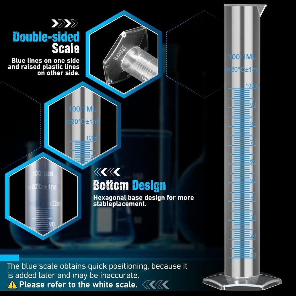 moveland Plastic Graduated Cylinders and Beakers with 5 Pipettes, 10ml 25ml 50ml 100ml Cylinders, 50ml 100ml 250ml 500ml 1000ml Beakers, Ideal for DIY and Kids Science Lab Product Details Color: Transparent Material: Plastic Capacity: 1E+3 Milliliters Brand: moveland Item dimensions L x W x H: 7.87 x 7.87 x 4.53 inches Color: Transparent Material: Plastic Capacity: 1E+3 Milliliters Brand: moveland Item dimensions L x W x H: 7.87 x 7.87 x 4.53 inches Item Weight: 0.25 Kilograms Manufacturer: moveland UPC: 661708722597 Product Dimensions: 7.87 x 7.87 x 4.53 inches Item Weight: 8.8 ounces Item model number: PL-CYLINDER-15 Is Discontinued By Manufacturer: No Mildew-resistant: Odorless Care instructions: Hand Wash Number of pieces: 14 Batteries required: No Included Components: 4 clear plastic cylinders(10, 25, 50, 100ml) , 5 transparent plastic beakers(50, 100, 250, 500, 1000ml), 5 disposable plastic dropper(3ml) , 1 test tube brush Durable Plastic Construction: Made from eco-friendly food-grade plastic for durability and non-toxicity. Multiple Sizes: Includes 4 plastic cylinder sizes (10-1000ml) and 5 plastic beaker sizes (50-1000ml) for versatile use. Clear Scale Lines: Standard metric scale lines on cylinders and beakers for accurate measurement. Flexible Pipettes: 5 included 3ml pipettes allow for precise transfer of small amounts of liquid. Hexagonal Base: Hexagonal base design provides stable placement and reduces measurement error.