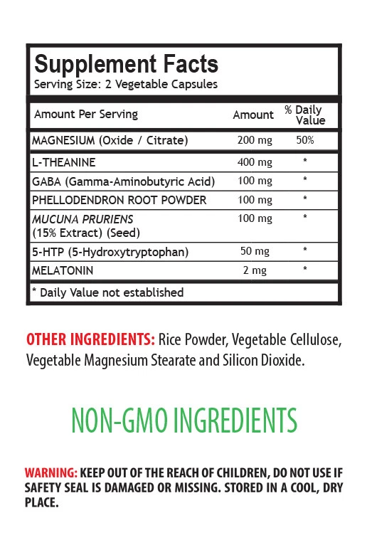 Premium Sleep Complex 952mg Promotes Healthy Sleeping Patterns Mood Support Anti- Supplement Liver Health Antioxidants -Made in USA- (1 Bottle, 60 Capsules) Benefits of Mucuna Pruriens Mucuna is an important herb from the Indian medical system called Ayurveda. These traditional people used mucuna pruriens in the treatment of snake bites. They also believe it has widespread therapeutic properties, using it since 1500 BC to treat ailments such as intestinal disorders, sexual response and melancholy mood. However, the benefits far outstrip these most ancient of applications, including a boost to testosterone, a boost to libido. It is easy to see why this Velvet Bean extract is thought to be magical. Benefits of Melatonin Melatonin is a hormone made naturally by your body. It is produced by the pineal gland in the brain but also found in other areas, such as the eyes, bone marrow and gut. It is often called the “sleep hormone,” as high levels can help you fall asleep. However, melatonin itself won’t knock you out. It simply lets your body know that it is night-time so you can relax and fall asleep easier. Melatonin supplements are popular among people struggling with insomnia and jet lag. Melatonin is also a powerful antioxidant, which may provide a variety of other benefits. In fact, it may help support eye health, treat stomach ulcers and heartburn, ease tinnitus symptoms and even raise growth hormone levels in men. Benefits of 5-HTP 5-Hydroxytryptophan (5-HTP) is an amino acid that your body naturally produces. Your body uses it to produce serotonin, a chemical messenger that sends signals between your nerve cells. Low serotonin levels are associated with depression, , sleep disorders, weight gain and other health problems. Therefore, increasing your body’s production of serotonin may have various benefits. For this reason, serotonin-producing 5-HTP supplements have become increasingly popular. Benefits of L-Theanine L-theanine is an amino acid found most commonly in tea leaves and in small amounts in Bay Bolete mushrooms. It can be found in both green and black tea. Most known for helping people relax, L-theanine has many other potential health benefits, including anti-, increased focus, strengthen the immune system, blood pressure control, and improved sleep quality. Supplement Facts: Serving Size: 2 Vegetable Capsules Servings per Container: 30 Servings Magnesium(Oxide/Citrate) 200mg L-Theanine - 400mg GABA(Gamma-Aminobutyric Acid) - 100mg Phellodendron Root Powder - 100mg Mucuna Pruriens(15% Extract)(Seed) - 100mg 5-HTP(5-Hydroxytryptophan) - 50mg Melatonin - 2mg OTHER INGREDIENTS: Rice Powder, Vegetable Cellulose, Vegetable Magnesium Stearate and Silicon Dioxide. WARNING: KEEP OUT OF REACH OF CHILDREN. DO NOT USE IF SAFETY SEAL IS DAMAGE OR MISSING. STORE IN A COOL, DRY PLACE. *These statements have not been evaluated by the FDA. This product is not intended to diagnose, cure, treat, or prevent any disease. GREAT QUALITY SUPPLEMENT