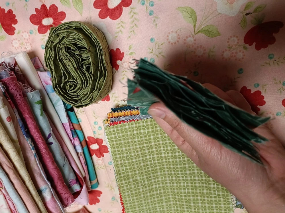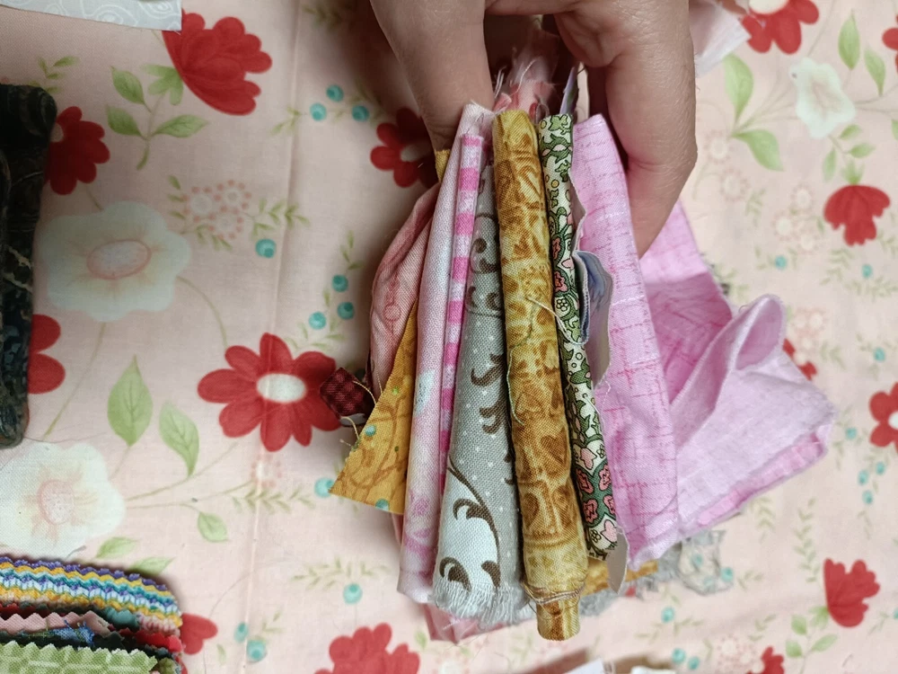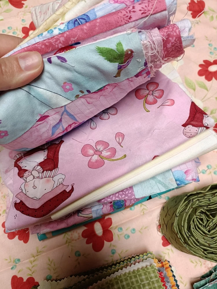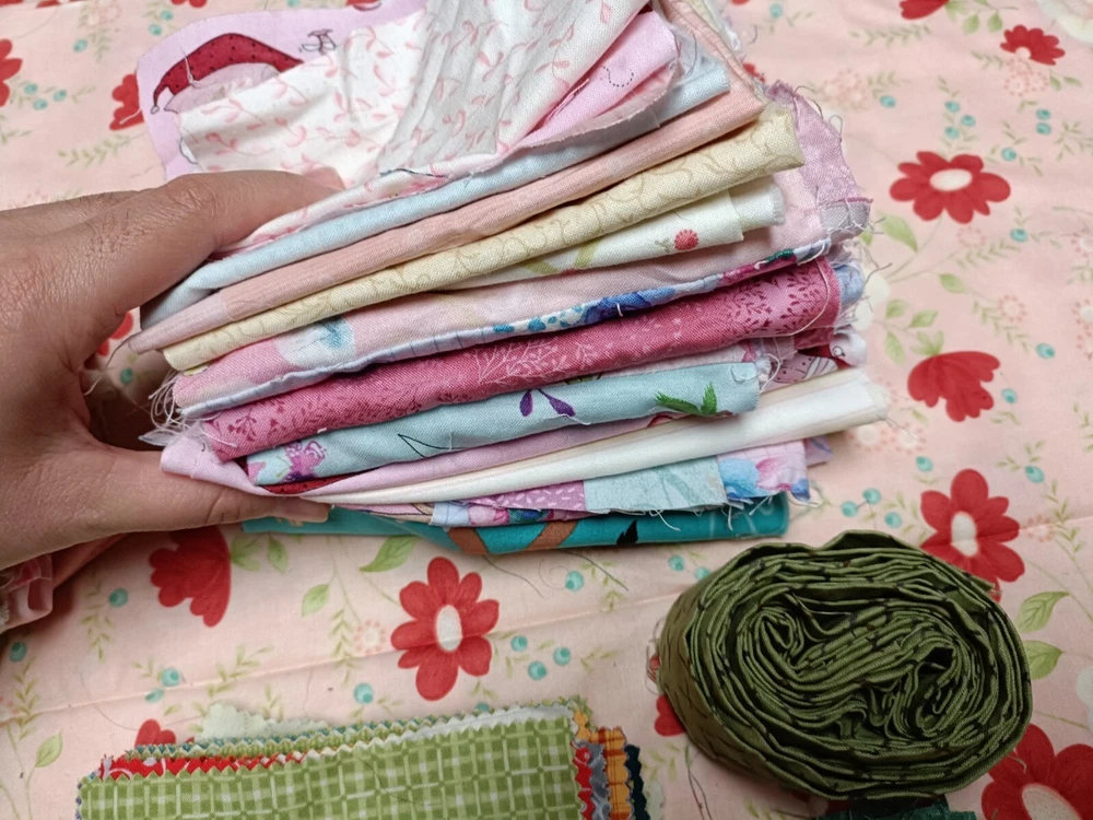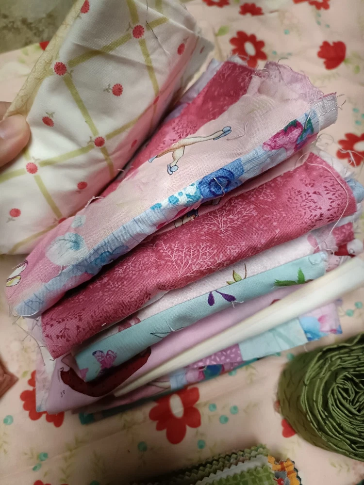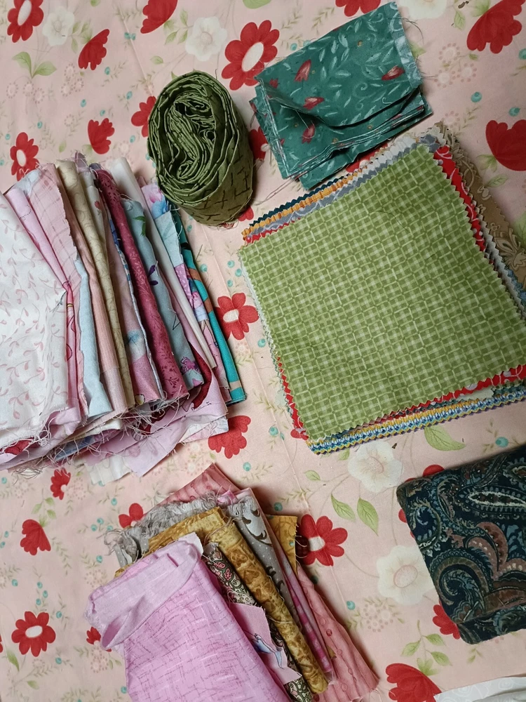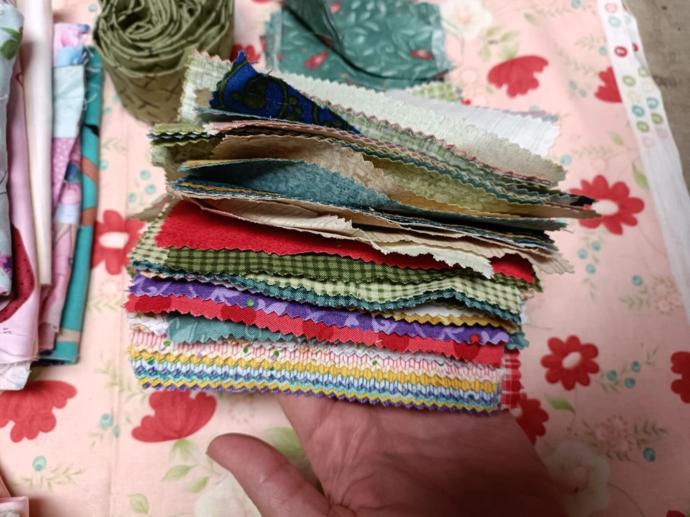 Beautiful cotton scrap fabric lot with different patterns/colors. Some are strips, some are squares, rectangles or pieces. Perfect for fabric crafts/quilting.