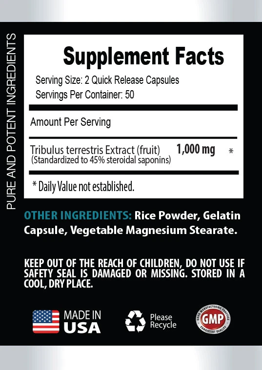 Tribulus Terrestris Extract 1000mg Natural Testosterone Booster Enhances Sexual Function Improves Sperm Motility Increases Muscle Mass Made in USA 2 Bottles 200 Capsules Benefits: Increases energy and endurance Increases stamina Alleviates chronic exhaustion (fatigue) syndrome Improves sexual function Enhances fertility Has a beneficial action on the circulatory system Joint & Bone Support Antioxidant Helps to build muscle Libido enhancer Tribulus has a long history of use in various systems of traditional medicine throughout the world, especially for sexual health. The primary active components in Tribulus are steroidal saponins. Uses of Tribulus Terrestris: Most uses of Tribulus relate to its ability to increase luteinizing hormone, which plays a role in testosterone production. Tribulus may support sexual functions, weight management and the cardiovascular system. The most significant signs that you may need Tribulus are generally the result of low testosterone levels, especially in men. These signs primarily include a low libido and difficulty in achieving an erection. Poor male fertility is also a sign that Tribulus could benefit you. Physically active men who need to gain weight may also want to use Tribulus. Additional signs that you may need Tribulus supplements include an unhealthy blood pressure. It is used to enhance sexual function, increase muscle mass and improve sperm motility. It is also touted in the treatment of other conditions such as urinary problems and skin conditions like vitiligo, according to Physicians Desk Reference website. In research, tribulus appears to protect the organs (mostly liver and kidneys) from oxidative damages and also exert anti-stress effects; confirming the status of tribulus terrestris as an adaptogen. Enhances Sexual Function: Tribulus terrestris has been used in traditional medicine to treat sexual dysfunctions. Mixtures of different compounds found in the fruits, stems and roots of tribulus terrestris provide its medicinal properties. According to the EmedTV website, early research suggests that tribulus terrestris may increase the levels of hormones such as tetstosterone and dehydroepiandrosterone, or DHEA. Increases Muscle Mass: Tribulus terrestris increases testosterone levels, which helps to increase muscle mass. Studies reveal an increase in testosterone levels when tribulus terrestris is taken. The rise in testosterone level reduces the time for the muscles to recover, and enhances protein synthesis, or the process that living cells manufacture proteins from their constituent amino acids, based on the genetic information carried in the DNA of the chromosomes. It also promotes positive nitrogen balance. The combination of these actions all help to strengthen and increase muscle mass. Improves Sperm Motility: Sperm motility and the ability of a sperm to penetrate the female egg, as well as the volume and concentration of the sperm, play significant roles in fertilizing the female egg. A double blind study done by L.Setiawan Airlangga University, Surabaya, Indonesia, 1996, investigated the effects of tribulus terrestris on men wtith oligoasthenoteratozoospermia, a common cause of male subfertility. The trial consisted of 30 infertile men. The conclusion showed that Tibullus terrestris, given at a dose of 500mg three times daily for 30 days, proved to be effective in restoring sperm functions like motility and acrosome reactions. Serving Size: 2 Quick Release Capsules Serving Per Container: 50 Amount Per Serving: Tribulus Terrestris Extract (fruit) - 1000mg (Standardized to 45% steroidal saponins) Other Ingredients: rice powder, gelatin capsule, vegetable magnesium stearate. WARNING: NOT FOR USE BY INDIVIDUALS UNDER THE AGE OF 18 YEARS. DO NOT USE IF PREGNANT OR NURSING. Consult a physician or licensed qualified healthcare professional before using this product. *These statements have not been evaluated by the Food and Drug Administration. This product is not intended to diagnose, treat, cure or prevent any disease. muscle building TRIBULUS TERRESTRIS 1000 tribulus terrestris powder - 200 Caps GREAT QUALITY PRODUCT