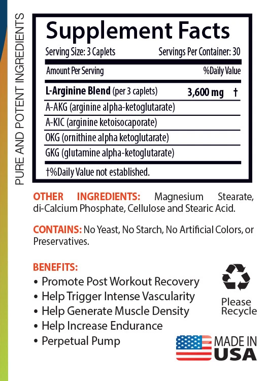 Nitric Oxide 3600mg Dietary Supplement Increase workout performance Promotes post workout recovery Helps generate muscle density Made in the United States (3 Bottles, 270 Caplets) What is Nitric Oxide? Nitric oxide is a gas that's made by your body, and one of its primary purposes is to promote vasodilation, or increased blood flow. In the body, "nitric oxide is secreted by the endothelial cells, which line the inner walls of the blood vessels, and it communicates with the smooth muscle cells, triggering them to relax," explains Nathan Jenkins, Ph.D., an assistant professor in the Department of Kinesiology at the University of Georgia. This blood flow regulation plays a role in multiple body functions, including maintaining erections, controlling blood pressure, and more. L-Arginine. L-arginine is a conditionally essential amino acid, meaning it only has to be consumed in the diet under certain conditions, while healthy adults can make all they need. It directly produces nitric oxide through a process called the L-arginine-NO pathway. Several studies support the use of L-arginine for increasing blood flow. Health Benefits of Nitric Oxide Formula 3600mg: Cardiovascular Health. Nitric oxide is primarily recognized for its role as a vasodilator on the cardiovascular system the compound acts to systemically relax the walls of blood vessels, thereby increasing blood flow and preventing the development of high blood pressure. The idea is that the beneficial results of this vasodilatation for athletes include increased oxygen transport, delivery of nutrients to skeletal muscle, muscle fiber repair, and improved endurance. The compound also slows the development of cardiovascular disease by preventing the formation of plaque on the inner walls of blood vessels. Finally, nitric oxide is important in maintaining effective pumping action of the heart; if there is not enough nitric oxide present, the heart may not pump efficiently enough to deliver blood to all parts of the body. Sex, and Your Heart. Nitric oxide is an intregal part of sex and heart health. Nitric oxide is made by the blood vessels' lining, or endothelium. The endothelium is exquisitely sensitive to the physical and chemical conditions inside our blood vessels. When the endothelium senses heart-healthy conditions, such as physical activity and low cholesterol, it releases more nitric oxide. And that’s a very good thing. Nitric oxide expands the blood vessels, increasing blood flow and decreasing plaque growth and blood clotting. OKG Boosts Muscle Growth. Ornithine alpha-ketoglutarate, or OKG, is a nutritional or dietary supplement which significantly boosts muscle development as well as enhancing the rapid growth of tissues. This amino acid is produced in the body in sufficient amounts through the enzyme metabolism and it is generated artificially from the amino acids ornithine and glutamine, both components having anabolic traits (meaning they boost muscle growth and the healing of tissues) as well as anti-catabolic properties (the traits of some chemicals which makes them produce the breaking up of complex molecules within the body as well as obstructing the developing of muscles). Ornithine has a vital part in the urea cycle of the body, while glutamine catalyzes protein synthesis. Ornithine also produces a major reduction of body fat, in the process of its fusing with arginine. GKG Repairs Muscles Faster. According to a study published in the September 1995 edition of Metabolism, researchers found supplementing with GKG supported a higher level of protein synthesis in hip replacement patients. Based upon this biological reaction, researchers feel the regular consumption of GKG stimulates protein synthesis. AKG (alpha-ketoglutarate) is the nitrogen-free portion of the amino acids known as glutamine and glutamic acid. It is formed in the Krebs cycle, the energy-producing process that occurs in most body cells. AKG is used by cells during growth. Supplement Facts Serving Size: 3 Caplets Servings per Container: 30 L-Arginine Blend(per 3 caplets) - 3,600mg A-AKG(arginine alpha-ketoglutarate) A-KIC(arginine ketoisocaporate) OKG(orinthine alpha-ketoglutarate) GKG(glutamine alpha-ketoglutarate) OTHER INGREDIENTS: Magnesium Stearate, di-Calcium Phosphate, Cellulose, and Stearic Acid. WARNING: KEEP OUT OF REACH OF CHILDREN. DO NOT USE IF SAFETY SEAL IS DAMAGED OR MISSING. STORE IN A COOL, DRY PLACE. *These statements have not been evaluated by the FDA. This product is not intended to diagnose, cure, treat, or prevent any disease. GREAT QUALITY PRODUCT