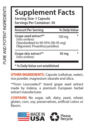 Grape Seed Extract 100mg Made in the United States 2 Bottles, 60 Capsules Studies suggest that grape seed extract may help: Improve circulation. Support oral health. Boost brain function. Normalize blood pressure. Strengthen bones and improve bone formation. Prevent blood sugar disorders by normalizing metabolic function. Most people know them for their plump, refreshing juiciness, as well as their characteristic seedlessness when cultivated for snacking purposes. Grapes have long held high status as being one of the world's most popular fruits, and they just so happen to be loaded with miracle nutrients that can help reverse the aging process while warding off degenerative diseases. The skins and seeds of grapes are particularly remedial for human health because they contain a treasure trove of powerful antioxidant compounds that science has linked to vibrant quality of life and longevity. Nearly every imbalance, ailment, and pathology afflicting modern man, in fact, is a potential target for the various nutritive substances found in grapes. This is why these bulbous little berries are among the most well-studied fruits within the realm of functional, food-based medicine. Contains Resveratrol. Resveratrol is arguably the most well-known therapeutic substance found in grapes, a natural outcome of everything that science has uncovered over the years about its incredible anti-aging potential. A fat-soluble polyphenolic compound, resveratrol's claim to fame centers around is prominence in longevity research. Many a study has shown its effectiveness at preventing and treating a wide range of age-related health conditions. The strong antioxidant effects of resveratrol make it an ideal nutritional supplement for combating the oxidative stress brought about by free radical damage. Resveratrol essentially neutralizes free radicals throughout the body, preventing them from stoking the types of inflammatory responses that end up leading to chronic health conditions. Anti-Aging Effects. But it doesn't stop at resveratrol. Grape seeds contain their own unique healing constituents as well that work symbiotically as a complement to resveratrol. Grape seeds are naturally rich in oligomeric proanthocyanidin complexes (OPC), a class of plant metabolites that studies have shown bear strong antioxidant. OPC are therapeutic in a number of ways, exhibiting antibacterial, antiviral, anti-inflammatory, and vasodilatory activities. They also help protect cell membrane lipids against oxidative damage; prevent platelet aggregation and blood clots; strengthen capillary integrity; and promote the function and efficiency of enzyme activity. Supplement Facts Serving Size: 1 Capsule Servings per Container: 30 Grape Seed Extract - 100mg (Vitis vinifera)(Standardized to 90-95%[90-95mg] Oligomeric Proanthocyanidins) Grape Skin Extract - 50mg (Vitis vinifera) OTHER INGREDIENTS: Capsule(cellulose, water), Rice Powder, Magnesium Stearate, and Silica. WARNING: KEEP OUT OF REACH OF CHILDREN. DO NOT USE IF SAFETY SEAL IS DAMAGED OR MISSING. STORE IN A COOL, DRY PLACE. *These statements have not been evaluated by the FDA. This product is not intended to diagnose, cure, treat, or prevent any disease. GREAT QUALITY PRODUCT