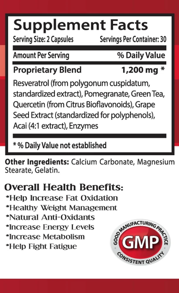 natural weight loss supplement - RESVERATROL SUPREME 1200 1 Bottles 60 Capsules RESVERATROL SUPREME 1200 NATURAL ANTIOXIDANT & FAT LOSS NATURAL METABOLISM BOOSTER Made in USA 1 Bottles 60 Capsules Overall Health Benefits: HelpS Increase Fat Oxidation Healthy Weight Management Natural Anti-Oxidants Increases Energy Levels Increases Metabolism Helps Fight Fatigue WHAT IS Resveratrol? Resveratrol is a naturally occurring polyphenolic fat-soluble compound and antioxidant that is often described as a modern-day fountain of youth. Studies associated with this antioxidant are so compelling that it is becoming one of the most favourite supplements as it shows a real promise of manifold health benefits. Resveratrol is one of the most unique among antioxidants because it can cross the blood-brain barrier to help protect our brain and nervous system. Medical research gives enough evidence to assume Resveratrol can be associated with numerous health benefits including protecting our cells against free radical damage, helping maintain strong heart and normal blood pressure, improving elasticity of our arteries, reducing the risk of strokes and heart attacks, helping brain disorders and other neuro-degenerative conditions, and reducing problems related to various inflammations. Resveratrol is found mostly in the skin and seeds of grapes, some dark berries (such as blueberries and bilberries), red wine, or peanuts. Grapes and some other plants such as Giant Knotweed, produce this antioxidant polyphenol as a defense against fungi. In grapes, significant concentrations of Resveratrol are found only in the skin, seeds and leaves. The amount of Resveratrol in grape skins depends on exposure to fungal infection, geographic origin and other factors. Resveratrol content in wines is usually low and unpredictable. A better food source of Resveratrol seems to be dark grapes, all the more since their consumption doesn’t involve the risk of alcohol addiction. Muscadine grapes have the highest concentration of Resveratrol in nature because of the thicker skins and seeds where it is concentrated. In addition, whole grapes contain other nutrients and active ingredients which are either much lower or absent in wine. However, the consumption of even the best food sources of Resveratrol may not be sufficient to produce the listed below health benefits due to the fact that in studies much higher concentrations of this antioxidant are used. AGEING & LONGEVITY Medical research indicates Resveratrol has the ability to slow down the ageing process and increase the life spans of numerous living organisms. Newer scientific research suggests the same antioxidant may also increase the life span of human cells. It was discovered that Resveratrol appears to slow down the effects of ageing by activating a gene called sirtuin. It is believed that the main function of the sirtuin enzyme is to increase our resistance to stress and the ability to survive. ENERGY & ATHLETIC PERFORMANCE It is believed that current growing popularity of Resveratrol as a supplement is due especially to its ability to help individuals by increasing energy production. In animal studies, Resveratrol has been able to significantly increase treadmill running time. Also in humans Resveratrol supplementation has improved athletic performance by increasing cardiovascular efficiency during exercise. Resveratrol has shown the ability to induce activity of a PGC-1α protein resulting in improved mitochondrial development in the brain, heart and muscle tissue; thus reducing oxidative stress and increasing number and efficiency of mitochondria (cell power stations). Consequently, with more mitochondria available in the muscle tissue more energy can be generated. This is also the reason why scientific research has suggested Resveratrol can improve exercise endurance performance. ANTI-INFLAMMATORY PROPERTIES Various health problems, including insulin resistance and blood sugar disorders, are associated with nuclear factor kappa B and the proliferation of this and similar pro-inflammatory enzymes. Therefore, any compound able to reduce these factors may provide benefits for health disorders. Medical research gives evidence that Resveratrol has the ability to reduce activation of the mentioned above pro-inflammatory protein complex (nuclear factor kappa B), indicating an anti-inflammatory effect in numerous conditions. HEART & BLOOD CIRCULATION Several randomized, placebo-controlled studies demonstrated that ingesting Resveratrol supplements improved atherogenic and inflammatory status in participants who were at risk for cardiovascular problems as well as in subjects already diagnosed with established heart problems. Resveratrol has shown to be beneficial in increasing blood vessel dilation, improving blood circulation by both reducing the formation of fatty plaques in blood vessels and decreasing the excessive clotting of platelets. Interestingly, the ability of Resveratrol to dilate blood vessels is attributed to an increase in nitric oxide signaling by the stimulation of potassium channels via calcium. SUPPLEMENT FGACTS: Serving Size: 2 Capsules Servings Per Container: 30 Amount Per Serving Proprietary Blend 1,200 mg Resveratrol (from polygonum cuspidatum, standardized extract), Pomegranate, Green Tea, Quercetin (from Citrus Bioavonoids), Grape Seed Extract (standardized for polyphenols) Other Ingredients: Calcium Carbonate, Magnesium Stearate, Gelatin. Contains NO corn, yeast, wheat, gluten, milk, egg,sugar, starch, salt, preservatives, artificial colors or flavors. Keep out of REACH of CHILDREN! Do not use if safety seal is damaged or missing. Store in a cool, dry place. PREMIUM QUALITY PRODUCT