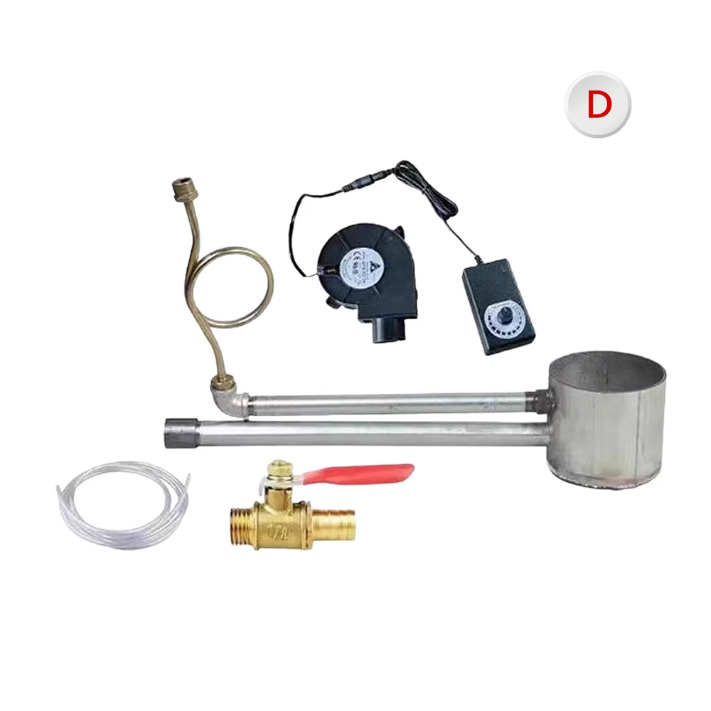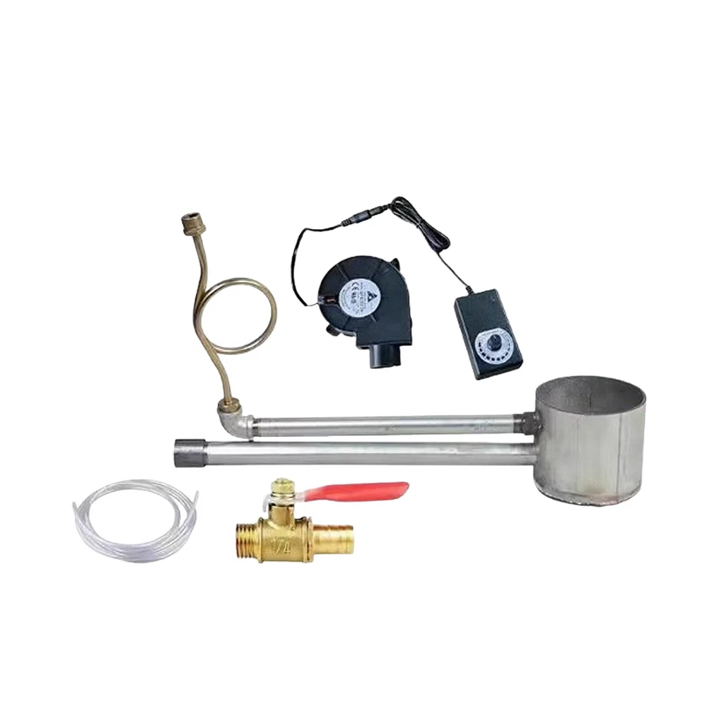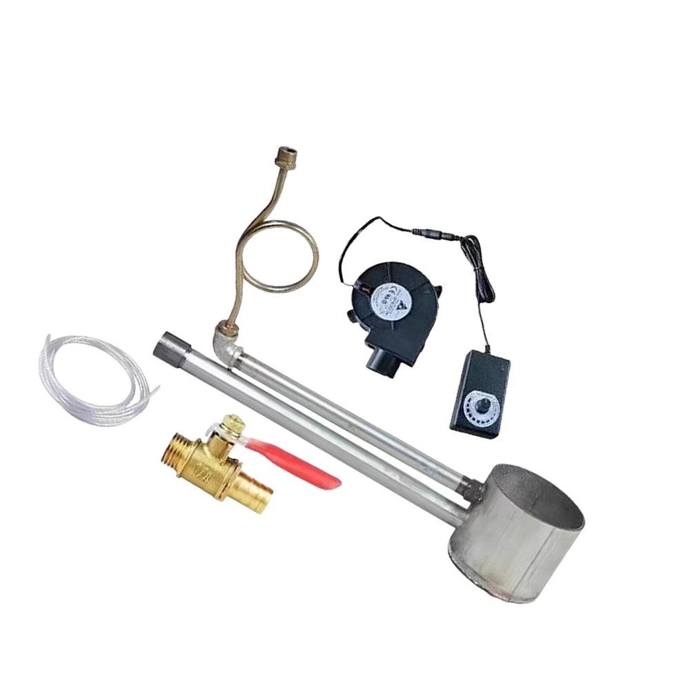 Waste Oil Burner Old Motor Oil Stove Cooking Heating Furnace Burning Tool This product is a new design of waste oil burning tool, with high pressure electric blower, which can make waste engine oil get fully burned. The experiment proves that when the waste oil is ignited, it takes only 3 minutes to boil 1 kg of water. It will help you make full use of used engine oil for heating, cooking, etc. Material: galvanized steel (The furnace will turn red after high temperature combustion, but it will not affect the use) Blower Input Voltage: 5-12V Instructions: 1. Prepare a bucket for waste oil by yourself and install the valve at the outlet. 2. Open the valve, let the oil flow into the burning furnace to a depth of 1 cm and then close the valve. 3. Ignite some flammable paper and put it into the furnace for full combustion. 4. Turn on the blower and wait for the waste oil to burn up gradually, adjust the air intake according to the fire speed. 5. Open the oil inlet valve and enter the combustion state, the fire will gradually increase. The furnace will burn better as the temperature rises.