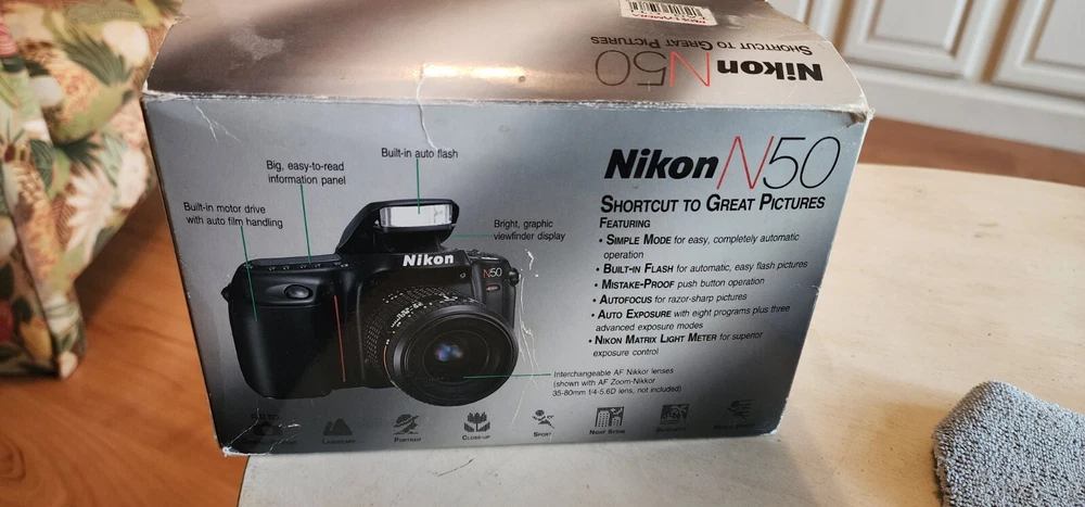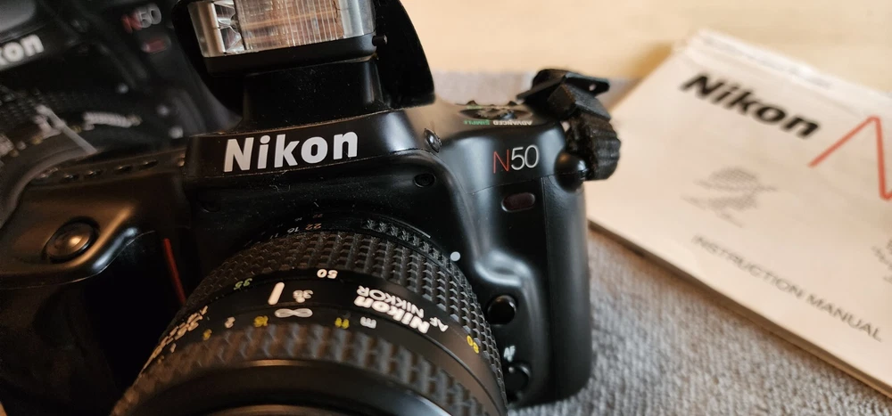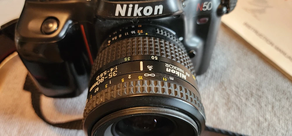 Capture moments with vintage flair using the Nikon N50 classic 35mm SLR film camera that combines manual precision with the ease of auto focus. This iconic black model from Nikon is designed for photographers who appreciate the tactile feel of a film camera and the versatility of a dual-focus system.Whether you're an avid collector or a photography enthusiast looking to delve into the world of film, the Nikon N50 is a fine choice for its simplicity and reliability. It comes with a Nikon/Nikkor 35 - 80 mm lens that allows you to experiment with different focal lengths to suit your creative vision. Original box and Manual included.