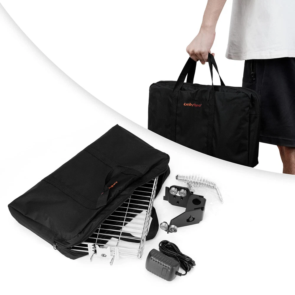【Dimensions】Steel support rod:32.8"; Spit rod:25.3"; Rotisserie basket:16.2"L*7.5"W; Car charging cable:3M 【Package Include】Black support rod*1, stainless steel spit rod*1, rotisserie basket*1, meat fork*2, car charging cable*1, 110V motor*1, power adapter*1, hand bag*1, motor bracket and handle. Hand bag for easy storage and carry. 【Dual-purpose Motor】Roasting should be easy and effortless, thats why our rotisserie comes with a dual-purpose motor. It can be powered with 2 "D" cell batteries (battery not in package), or use it with the power adapter. 360 full degaree rotation, you no longer need to sit around and turn the rod yourself. 【Extra 3M Car Charging Cable】But when you can't find any power supply and socket outdoors, our car charging cable can help you solve the problem. It can be directly connected with your car battery box, easily convert to the power supply for the grill. 【Wid Range of Application】Works with any open fire or most heat source such as gas grills, charcoal grills, fire pits, or campfire. We offer two meat forks and one ba