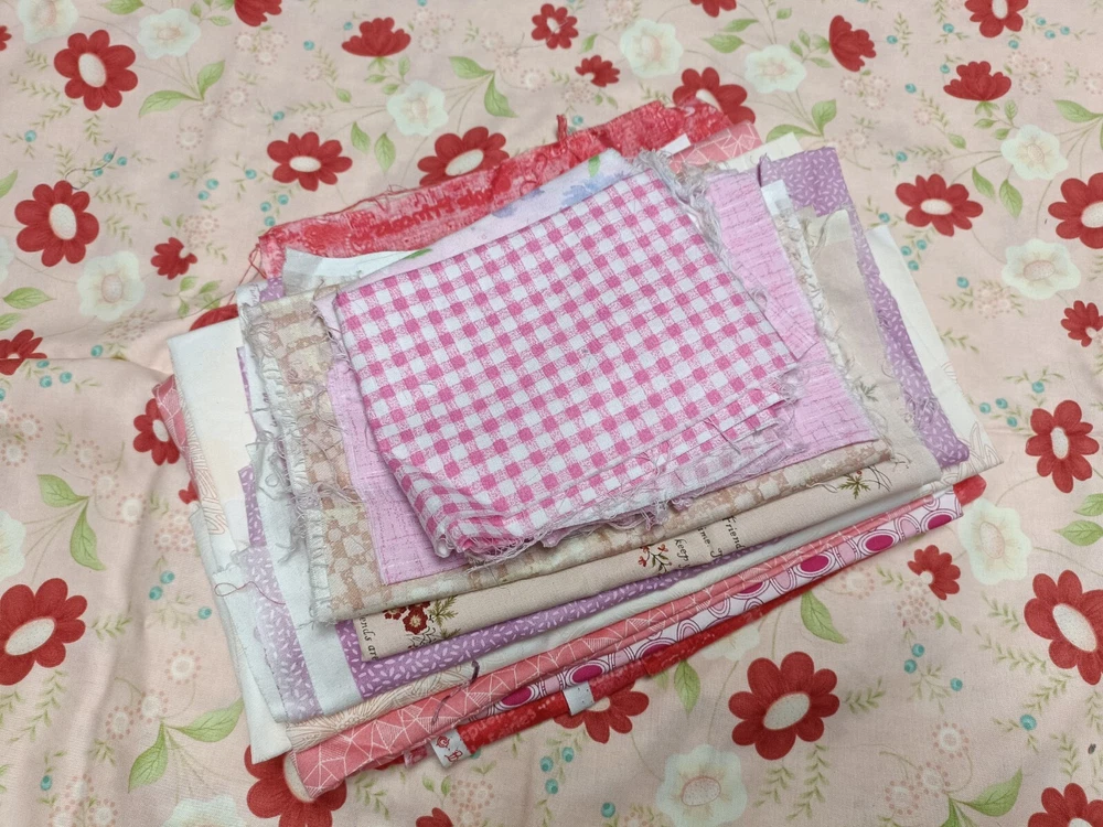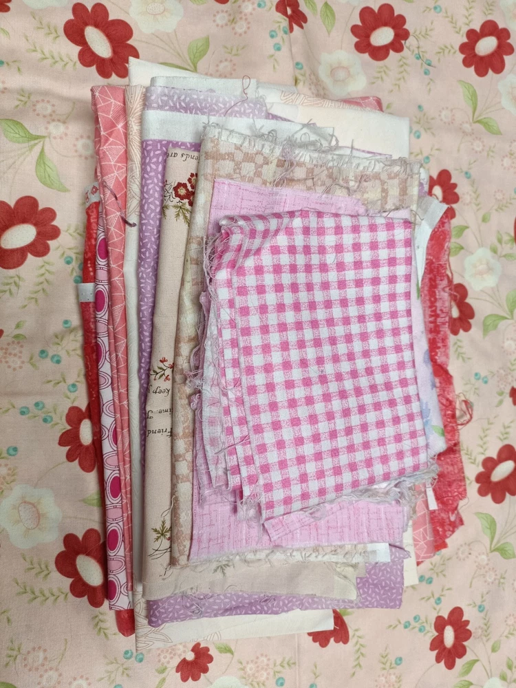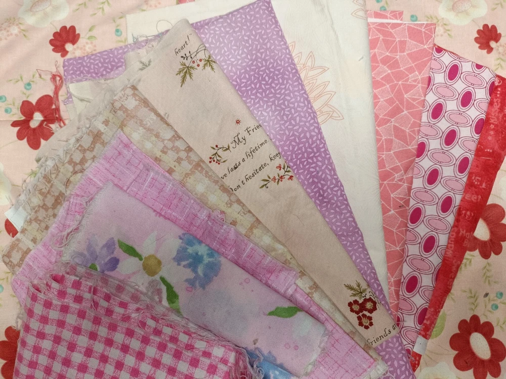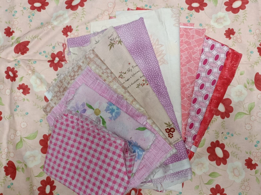 Pretty pink/purple/red cotton scrap fabric lot perfect for quilting or other textile crafts. High quality versatile fabrics. Includes fabrics with florals, plaids, abstract imagery, picturesque cartoons, etc. some are cut in square, others may be strips or rectangles.