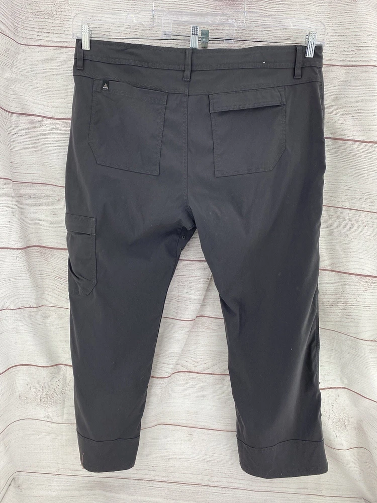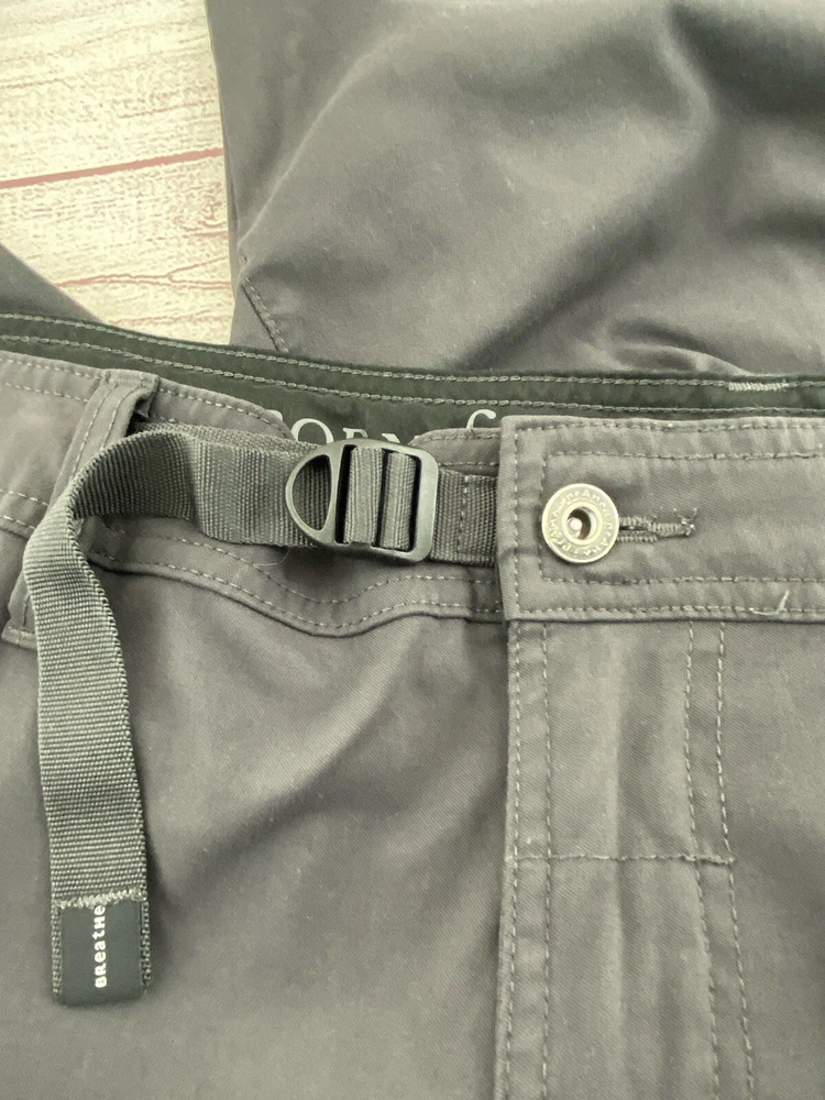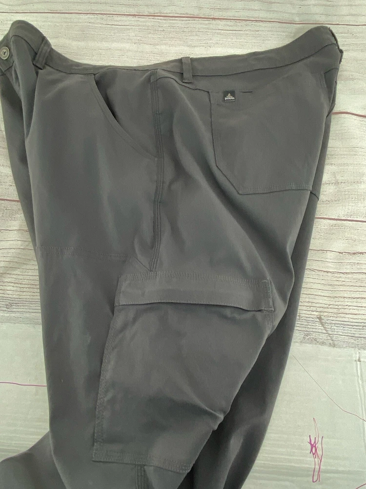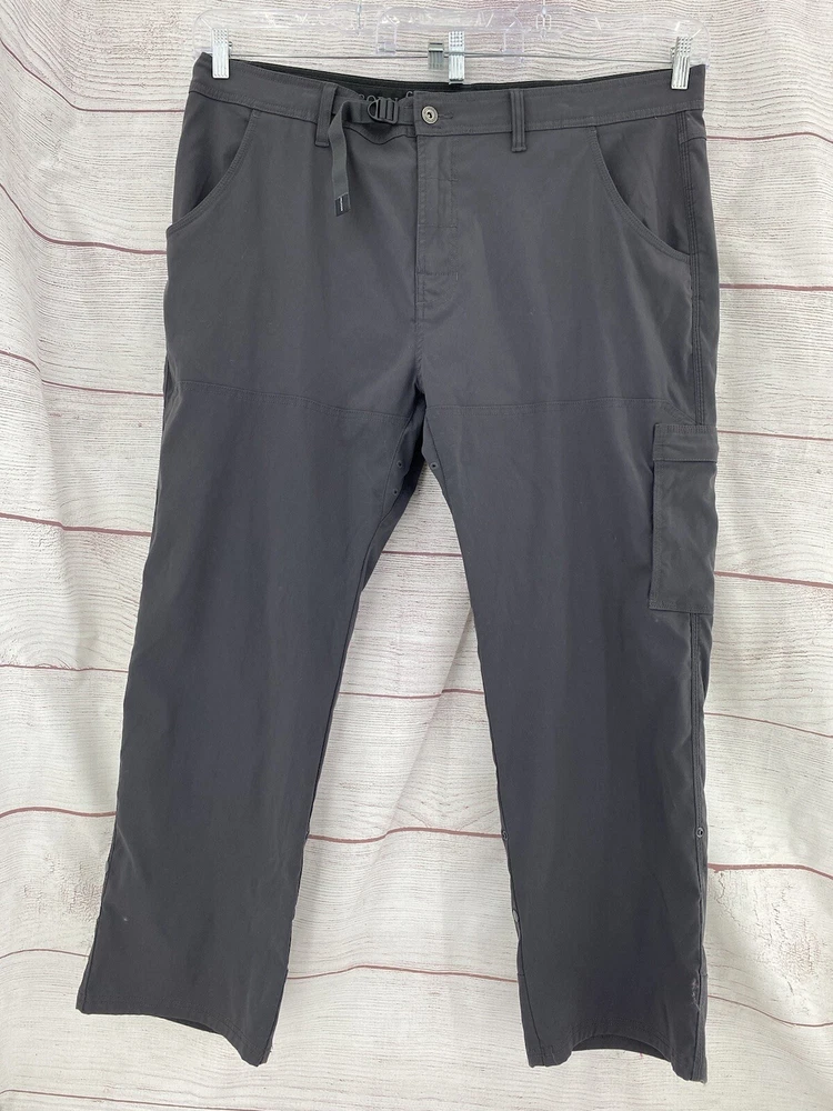 Explore the outdoors with these prAna Zion hiking pants in a versatile gray color. Made with a blend of nylon and elastan, these pants offer comfort, stretch, and breathability. The pants feature an adjustable waist, cargo pockets, and a flat front. Perfect for any occasion, whether it be traveling, casual wear, or workwear. The pants also have a roll-up design and are suitable for all seasons. These pants are cropped, have a straight leg style, and are available in size 42 with a 29-inch inseam. The prAna pants are easy to care for as they are machine washable. The logo accents add a touch of nature and outdoor style to the pants.