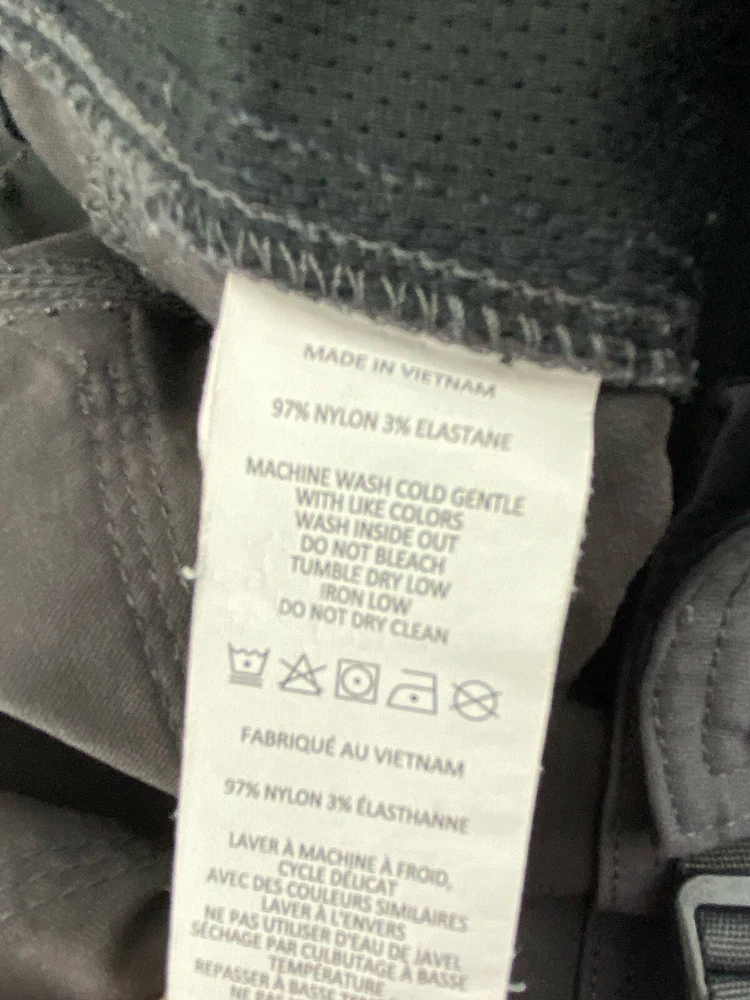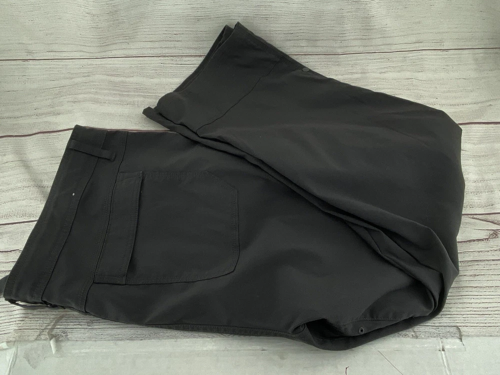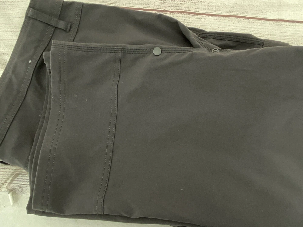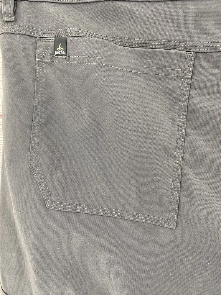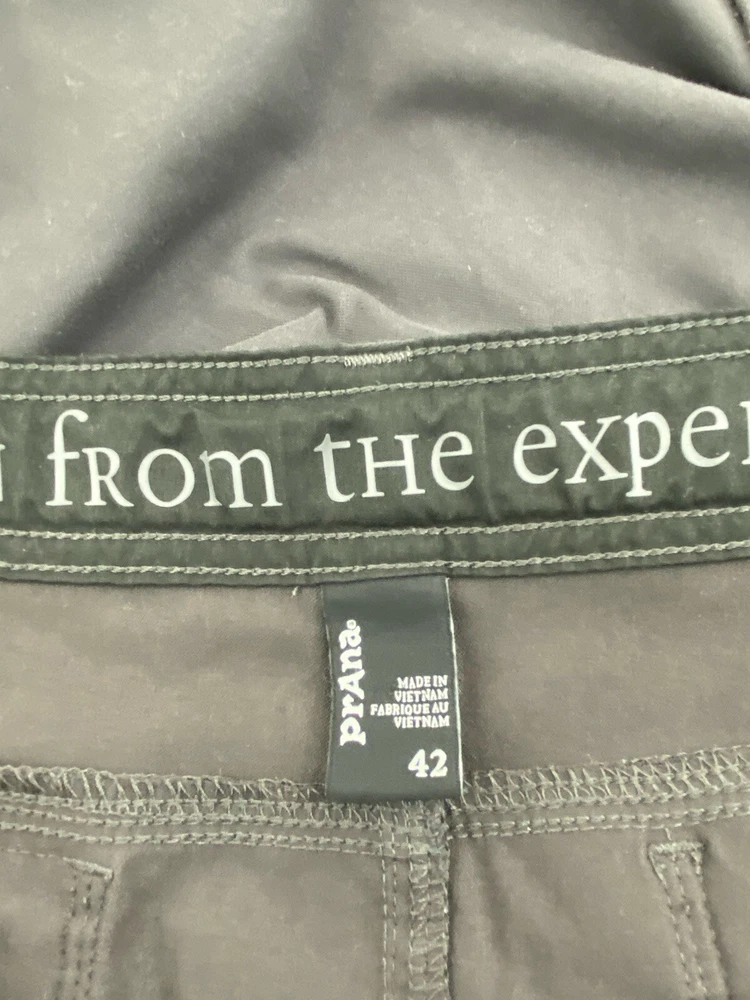 Explore the outdoors with these prAna Zion hiking pants in a versatile gray color. Made with a blend of nylon and elastan, these pants offer comfort, stretch, and breathability. The pants feature an adjustable waist, cargo pockets, and a flat front. Perfect for any occasion, whether it be traveling, casual wear, or workwear. The pants also have a roll-up design and are suitable for all seasons. These pants are cropped, have a straight leg style, and are available in size 42 with a 29-inch inseam. The prAna pants are easy to care for as they are machine washable. The logo accents add a touch of nature and outdoor style to the pants.
