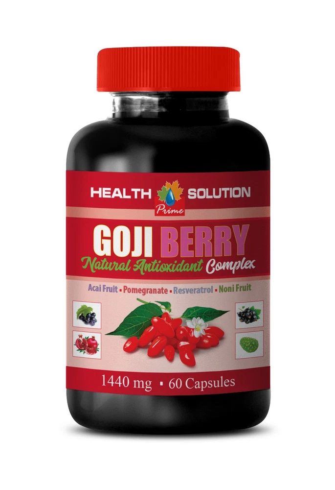 Goji Berry 40% Extract Acai Fruit , Pomegranate , Resveratrol , and Noni Fruit -Made in the United States- (1 Bottle, 60 Capsules) What are Goji Berries? Goji berries have been used in traditional Chinese medicine for over 2,000 years. Some legends report that goji berries were eaten by monks in the Himalayan Mountains thousands of years ago and steeped in hot water to help aid meditation and obtain greater health, vitality, longevity, energy and stamina, among other goji berry benefits. Benefits of Goji Berries: Packed with Antioxidants - Like most other superfoods, goji berries are an excellent source of antioxidants that help boost the immune system and protect the body from high levels of inflammation since they fight free radical damage. In terms of the quantity of antioxidants present in goji berries, they have a high ORAC value along with other beneficial berries, which indicates their exceptional ability to reduce oxidative stress. Promotes Eye Health - Goji berry benefits also include the ability to protect eyes from age-related diseases like macular degeneration, the leading cause of blindness in older adults. Goji berries are a natural treatment for macular degeneration and beneficial for vision because of their high levels of antioxidants (especially zeaxanthin), which can help stop damage from UV light exposure, free radicals and other forms of oxidative stress. Stabilize Blood Sugar - Especially useful for people with diabetes, goji berries benefits also help control the release of sugar into the bloodstream, which prevents spikes and dips due to problems balancing glucose levels. Evidence shows that gojis exhibit significant hypoglycemic effects and insulin-sensitizing activity by increasing glucose responsiveness. As part of a healthy diet, a natural diabetes remedy and a way to increase insulin sensitivity, goji berries are one of the best choices for those with trouble balancing blood glucose levels and its effects. Detox & Cleanser - Goji berries are believed to offer liver protection and are used along with traditional herbs like licorice, ganoderma, gynostemna and pentaphylla in many liver cleanses. This is one reason they're commonly used as a tonic ingredient in soups and to make sweet or savory porridges for people who are sick. Supplement Facts: Serving Size: 2 Capsules Servings per Container: 30 Goji Berry 40% Extract - 300mg Trans-Resveratrol - 20mg Proprietary Blend - 1170mg Consisting of: Acai Fruit, Noni Extract, Mangosteen Extract, Pomegranate Extract, Raspberry Fruit Powder, Black Cherry Fruit Powder, Blueberry Fruit Powder, Elderberry Extract, Grape Skin Extract. OTHER INGREDIENTS: Gelatin(Bovine), Vegetable Magnesium Stearate, and Rice Flour. KEEP OUT OF REACH OF CHILDREN. DO NOT USE IF SAFETY SEAL IS DAMAGED OR MISSING. STORE IN A COOL, DRY PLACE. *These statements have not been evaluated by the FDA. This product is not intended to diagnose, , , or any disease. PREMIUM QUALITY PRODUCT