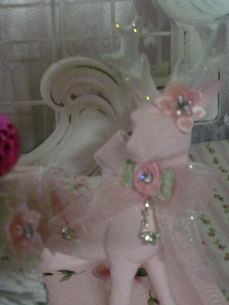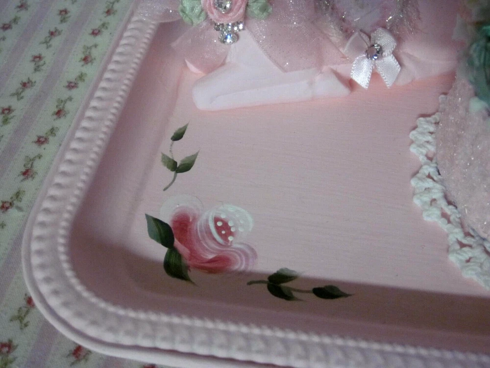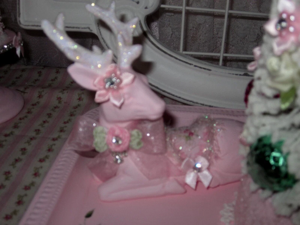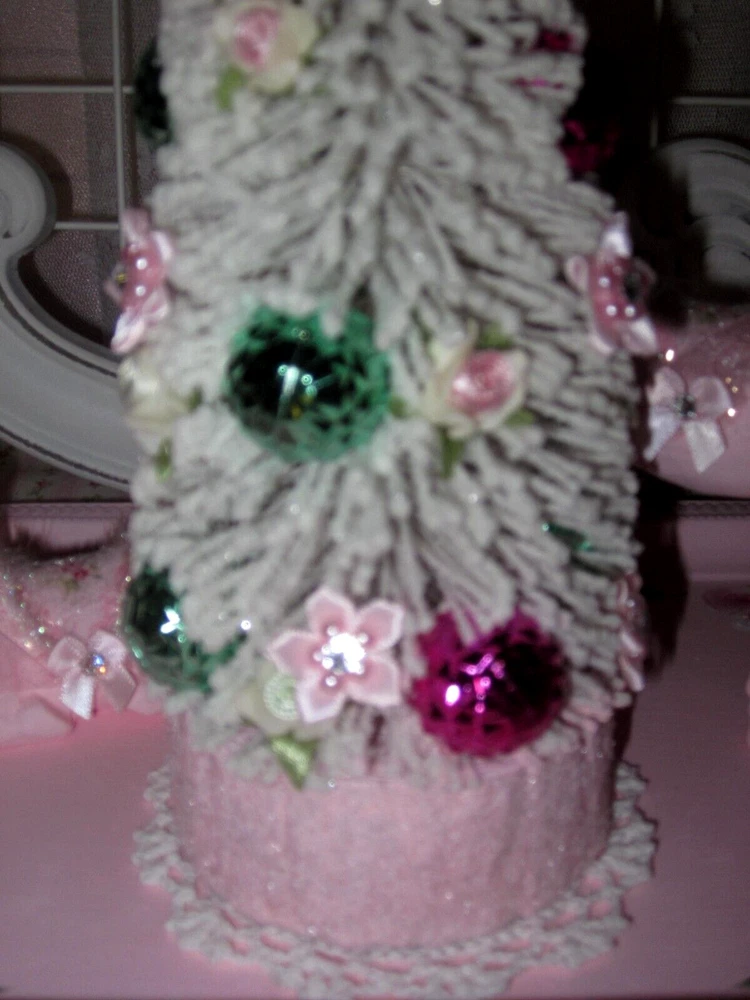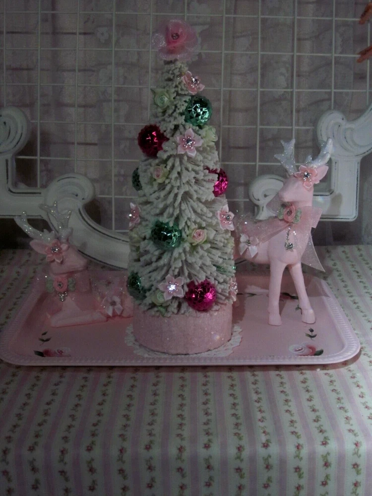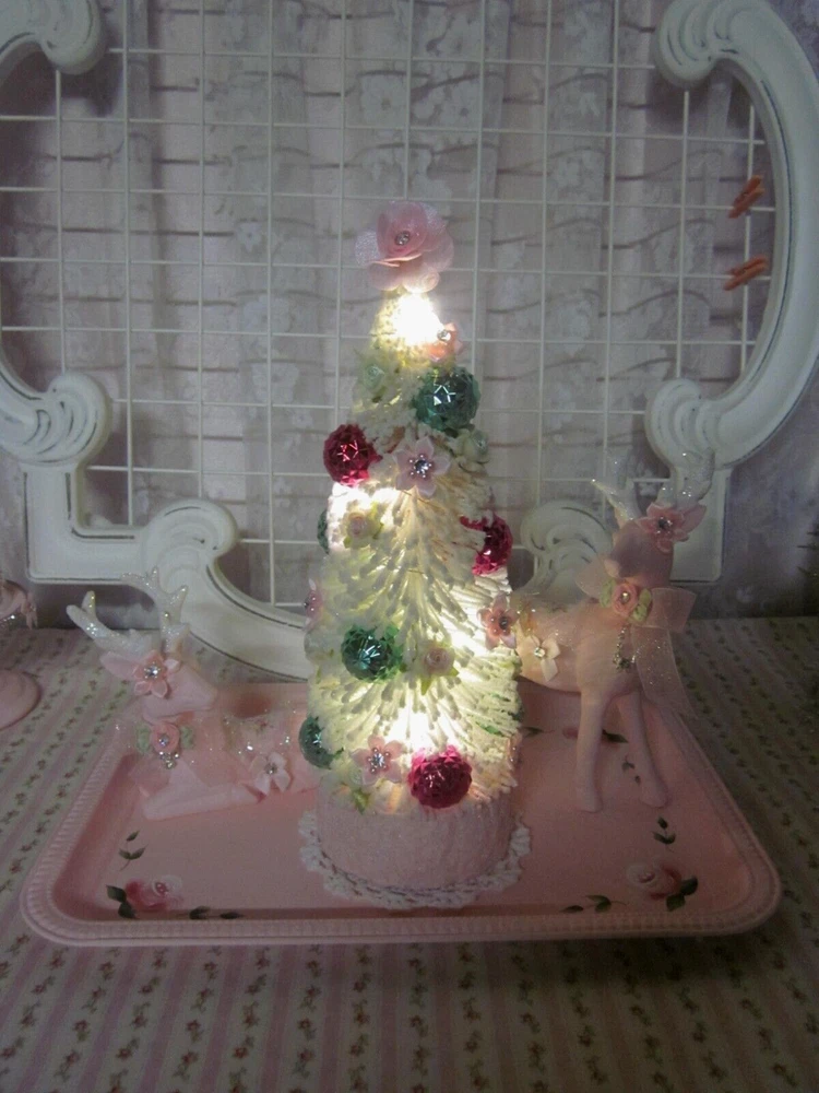 SO SHABBY PRETTY....THIS IS A SWEET SET..PERFECT FOR YOUR HOLIDAY DECORATING....ALL HAND PAINTED ..WITH SHABBY LITTLE PRETTIES....JEWELS....AND A BATTERY OPERATED DECORATED SHIMMER BOTTLE BRUSH TREE...PINK ROSES..WITH SAGE ACCENTS..SNOWMAN ELF.....WITH PINBATTERIES NOT INCLUDED....WHAT A PRETTY DISPLAY...THIS IS 10 1/4" HIGH AND 10 3/4" WIDE..SITTING ON THE TRAY....THANKS.....