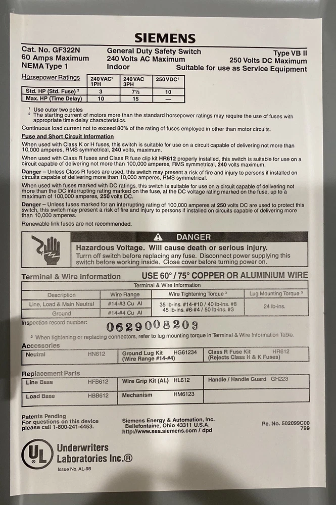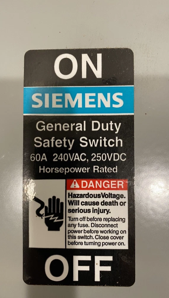 This Siemans heavy duty safety switch is a reliable and durable solution for your commercial or industrial needs. With a capacity of 60 amps and a voltage range of 240VAC/250VDC, this 3-pole switch with 4 wires is designed to provide maximum safety and protection against short circuits and overloads. Its robust metal construction and high-quality materials ensure long-lasting performance and reliability. Ideal for use in a variety of electrical equipment and supplies, this switch is a must-have for any business or industrial application. UPC # 783643148130 item is new in a shop-worn box