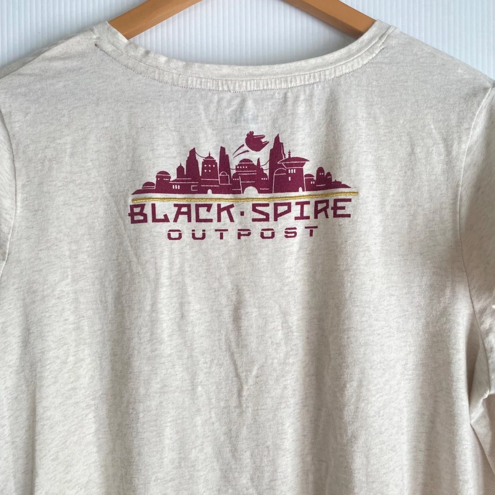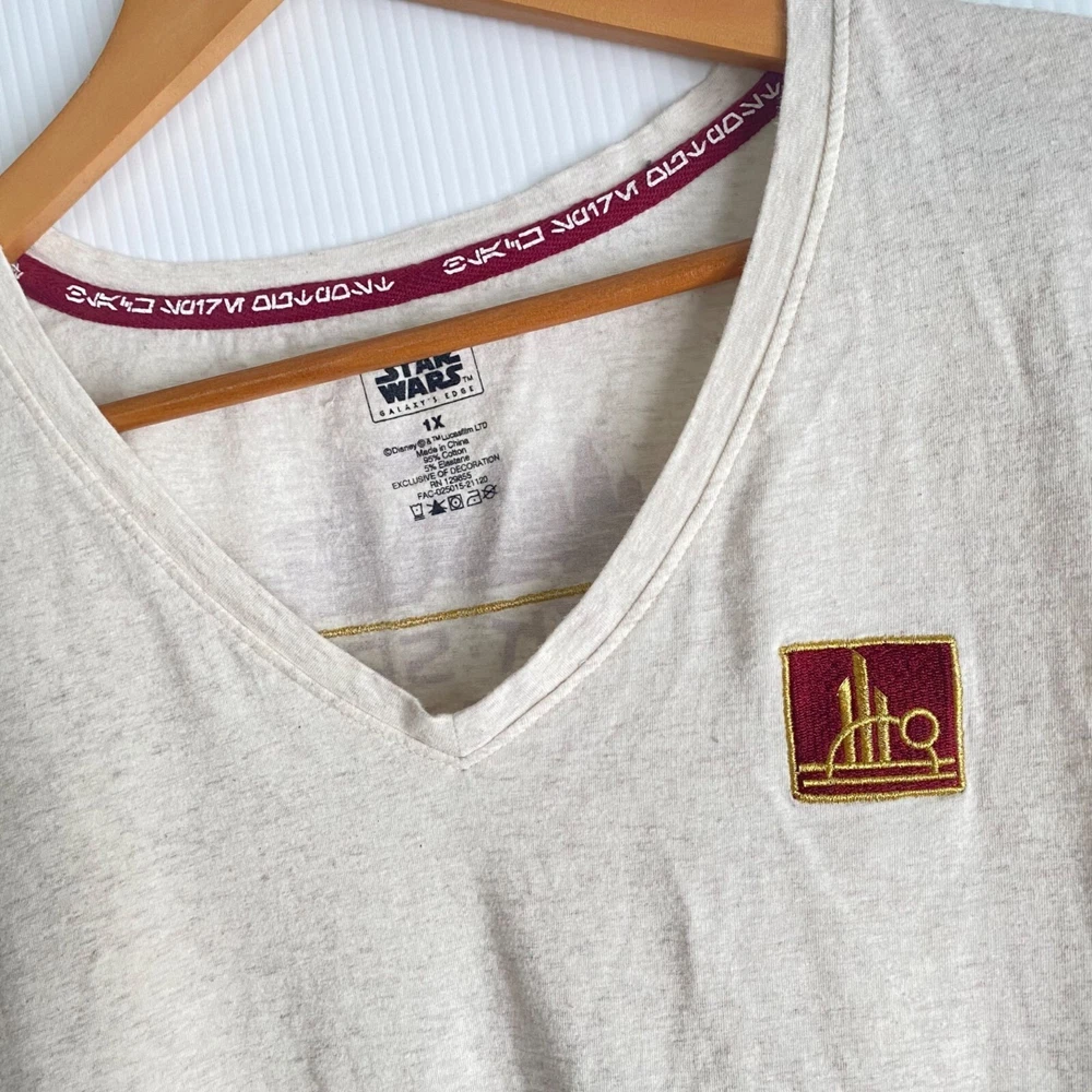 size 1x womens Star Wars Galaxy's edge black spire outpost v-neck tee t-shirt 95% cotton, 5% elastane Great condition. Little to no fade, minimal wash wear, no stains length: 28" armpit width: 23.5" disney star wards, disney, star wars, lucasfilm, star wars tee, black spire, black spire outpost, 1x, size 1x, star wars tshirt, tshir,t t-shirt, star wars t-shirt