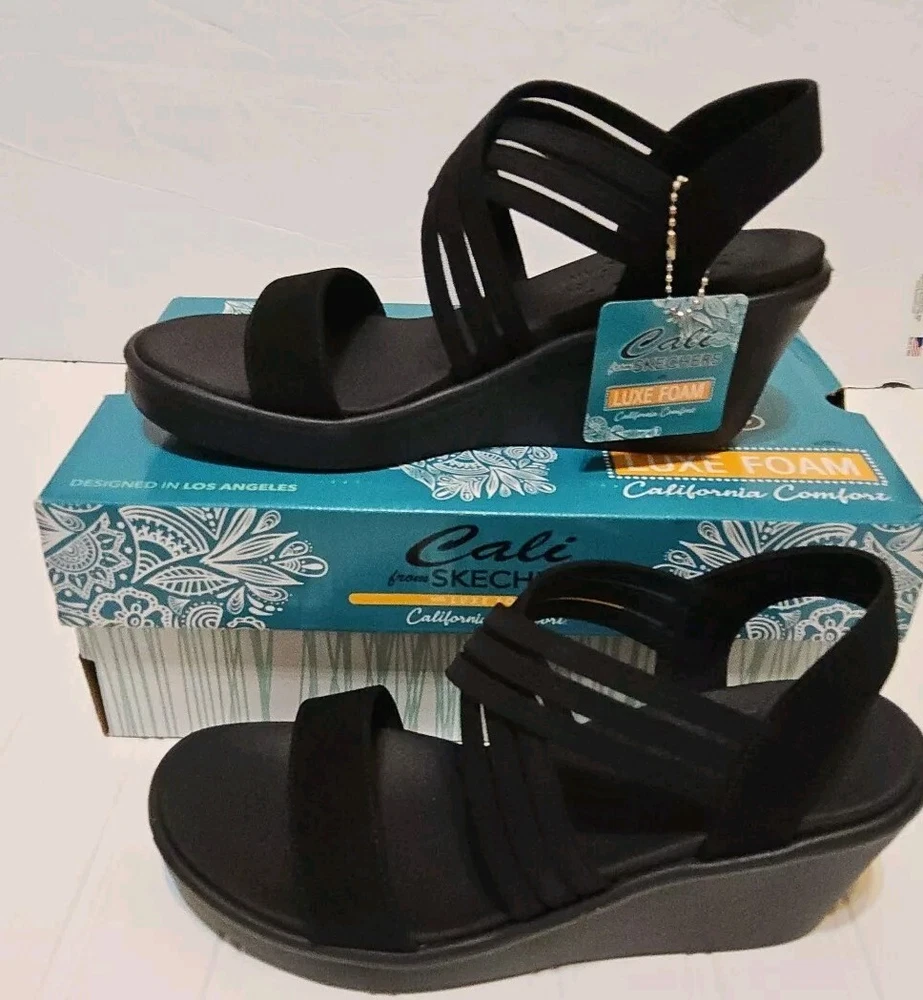 Step out in comfort and style with these sleek Skechers Cali sandals. Featuring a classic black synthetic upper and a versatile solid pattern, these sandals are perfect for any occasion. The slip-on design makes them easy to wear, while the wedge heel provides a comfortable lift. With a mid-height heel, these sandals offer both style and comfort, perfect for those long summer days. The breathable material ensures your feet stay cool and comfortable, while the sturdy construction provides durable wear. These sandals are perfect for any woman looking for a versatile, stylish shoe option.