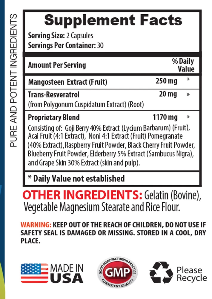 Mangosteen Extract With: Acai Berry , Noni Extract , Pomegranate , Goji Berry , Resveratrol , Raspberry . -Made in the United States- (2 Botte, 120 Capsules) What is Mangosteen? Also referred to as the Queen of Fruits, and the Food of the Gods, Mangosteen is the sweet and tangy fruit grown in various parts of South-East Asia like Thailand, Malaysia and Singapore. It also happens to be the national fruit of Thailand. Purple in colour, the fruit has a white fleshy pulp, segmented with seeds. Source of Antioxidants. Mangosteen is a rich source of antioxidants and vitamins. The special antioxidant found in abundance that gives the fruit a superior edge, is a class of naturally occurring polyphenol compounds known as Xanthones. Mangosteen has two classes of Xanthones -alpha mangosteen and gamma mangosteen. The mangosteen fruit is said to contain at least 20 known Xanthones, majority of which are found in the fruit wall or pericarp of the fruit. Xanthones work to reduce oxidative stress caused by free radicals. By damaging the free radicals, these antioxidants protect the body from various diseases, ranging from common cold and flu, and heart disorders. Boosts Immunity. The Xanthones coupled with vitamin C found in abundance in mangosteen work wonders for an enhanced and improved immunity system. While Xanthones do their bit in fighting the free radicals, Vitamin C promotes the production and function of leukocytes or the white blood cells, which are majorly responsible for good immunity. Blood Pressure Support. The abundant quantities of potassium, copper, magnesium, and manganese containing in mangosteen can help regulate your blood pressure. Potassium especially weeds out the negative effect infused by excess intake of salt. It also promotes heart health by maintaining normal heart rate and keeping risk of coronary attacks at bay. Mangosteen also reduces the cholesterol levels in your body, thus further checking the blood pressure and the consequent heart ailments. Boosts Skin Care. Mangosteen's high antibacterial and antimicrobial properties and the star component Xanthone can bring down the risk of many skin diseases to a great extent by repairing the damaged cells. And who can overlook the high component of Vitamin C, which further boosts skin health. Mangosteen has also been used traditionally to treat acne. Its ability of scavenging free radicals coupled with the suppression of production of Cytokins can prevent your skin from developing acne. Mangosteen can also reduce signs of ageing. The signs of ageing are also brought about by oxidative stress caused by free radicals, which is battled efficiently by the antioxidants of mangosteen. The antioxidant Catechin especially works wonders for your skin by preventing wrinkles and signs of ageing. Supplement Facts: Serving Size: 2 capsules Servings per Container: 30 Mangosteen Extract (fruit) - 250mg Trans-Resveratrol - 20mg Proprietary Blend - 1170mg Consisting of: Goji Berry 40% Extract(fruit), Acai Fruit(4:1 Extract), Noni 4:1 Extract(fruit), Pomegranate(40% Extract), Raspberry Fruit Powder, Black Cherry Fruit Powder, Blueberry Fruit Powder, Elderberry 5% Extract, and Grape Skin 30% Extract(skin and pulp). OTHER INGREDIENTS: Gelatin(Bovine), Vegetable Magnesium Stearate, and Rice Flour. WARNING: KEEP OUT OF REACH OF CHILDREN, DO NOT USE IF SAFETY SEAL IS DAMAGED OR MISSING. STORE IN A COOL, DRY PLACE. *These statements have not been evaluated by the FDA. This product is not intended to diagnose, cure, treat, or prevent any disease. GREAT QUALITY PRODUCT