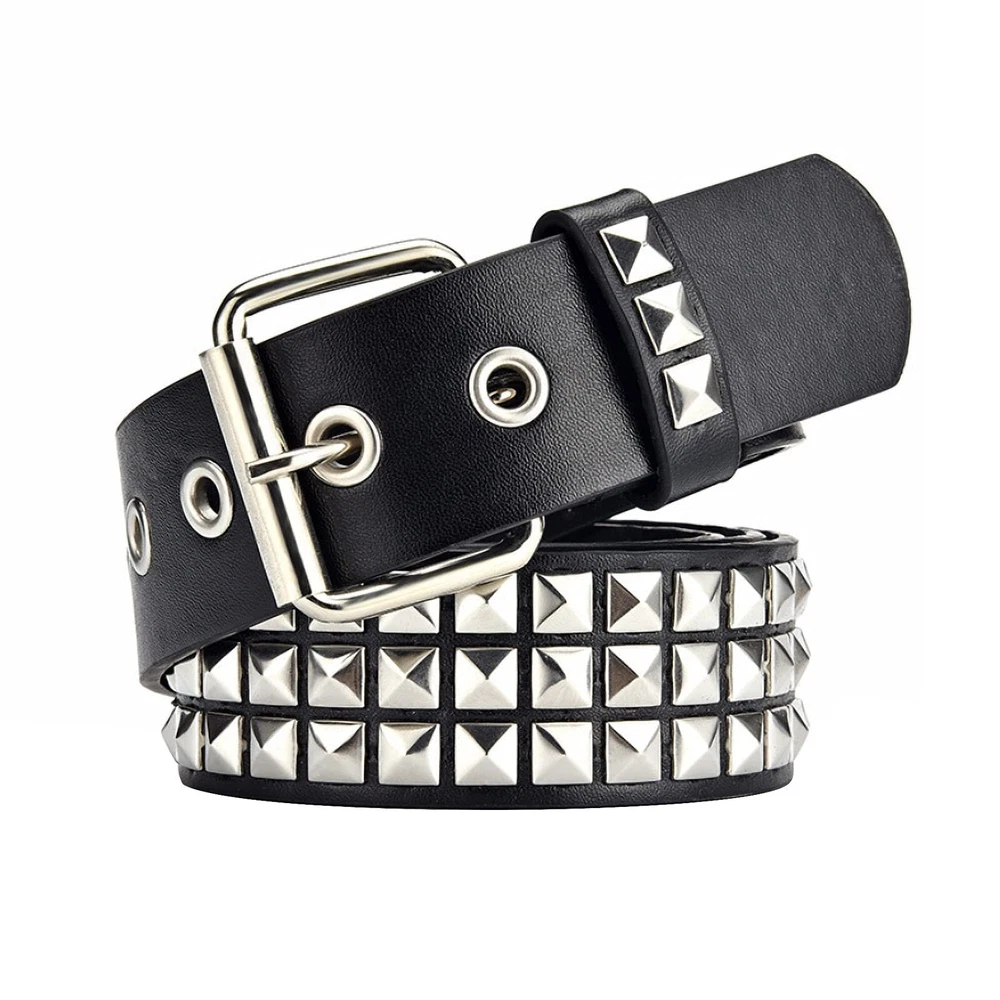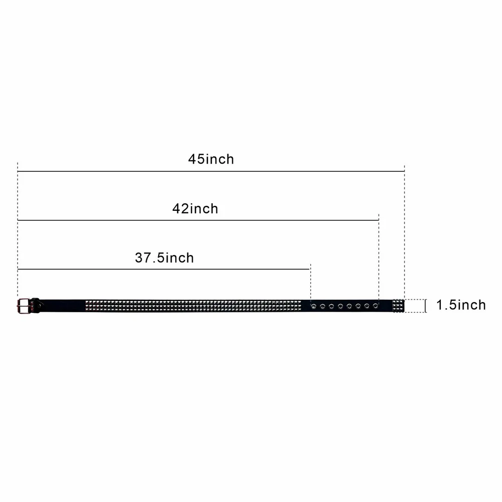 Specification Material: artificial leather + metal rivets + metal roller buckle Colors: Black, White Belt Width: 1.5 inch Belt Length: 43 inch Style: Punk Rock Package included: 1 × PU Leather Belt Note: 1.Actual color may be slightly different from the image due to different monitor and light effect. 2.Please allow slight measurement deviations due to manual measurement. 【BELT SIZE】Double grommet belt and studded belt are 45 inches in length and 1.5 inches in width, There are proper distance between grommets, enough holes for you to adjust the belt fits more waistline size. 【PREMIUM MATERIAL】: The studded belt is made of artificial leather, soft to the touch and comfortable to wear. Three rows of durable silver nails, each rivet is classic inlaid, not easy to damage and not easy to fall off. 【PUNK DESIGN】This classic pyramid punk rock rivet belt consists of a black buckle PU leather belt with cool silver buckles and three rows of pyramid-shaped metal inlays, which highlighting the rock punk design style.. 【APPLICABLE OCCASIONS】punk rivet costume elements incorporated into the belt design. When you wear this belt, you can participate in any occasion you want, including daily life, work, parties, parties, fancy dress parties, gothic, cosplay clothing, etc. 【CUSTOMER SERVICE】If you are unsatisfied with our products,please don’t hesitate to let us know.We will provide 24-hour online service to solve it according to your choice.