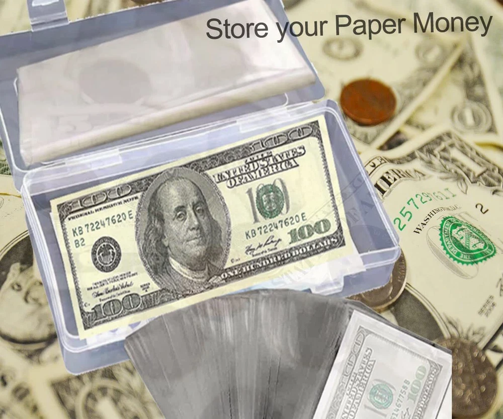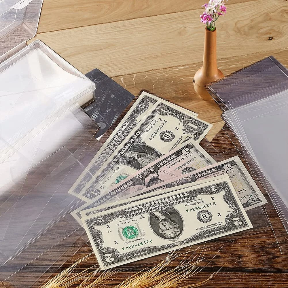 Product Description : 100 Pieces Clear Paper Money Sleeves with Storage Box, plastic dollar holders , Currency Album Organizer ,Dollar Bill Holder Box for Currency, Money, Bill, Banknote, Stamp etc.Imagine receiving this box for your birthday or graduation filled with money .... it will certainly make an amazing and joyful impression! Features: - Made of PP material, crystal clear, thick and durable - Prevent your collection from water, dust and breakage - Transparent design allows you to appreciate your collection - A good way to display your collection - Great for organizing currency, banknotes, souvenirs, stamps, etc - Perfect gifts for friends who have the same collection hobby as you Specification: Material: PP Color: Transparent Size of transparent bag: 17x8.5cm/ 6.71x3.32 inch Size of money storage box: 18.4x9.4x4 cm/ 7.27x3.72x1.58 inch Package Includes: 100 x transparent paper money bags 1 x money storage box Note: Manual measurement, please allow slight errors on size. The color may exist slight difference due to different screen display. 【You Will Get】100 pieces of clear paper money sleeves , a translucent storage box, suitable for store paper dollar bills, Slab Holder, Banknote, Stamp 【Mini Portable Dimension】The clear paper money sleeves size is:17.5 x 9cm/6.92 x 3.55inch; the storage box is: 18.4 x 9.4 x 4cm/7.27 x 3.72 x 1.58inch, this size is suitable for many kinds of banknotes and commemorative coins and other collectibles 【Quality material】Our currency sleeves are made of PVC, thicker and transparent, no softener, no harm to banknotes or currency, dust-proof and reliable, suitable for displaying currency and keeping it clean 【Nice Gift】The currency holder is good choice for collector, friends, colleague, family who are loving collecting banknotes 【 Friendly Customer Service 】 If you have any concerns, please feel free to contact us anytime. Our friendly and reliable customer service will respond to you within 24 hours. Your satisfaction is our greatest encouragement