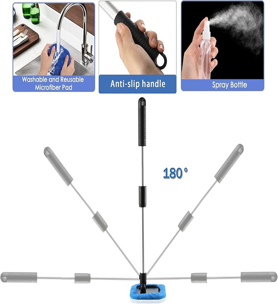 tCar Windshield Cleaning Tool inside Window Cleaner Defogger Brush Kit Microf... Color: Square Set FAST & EASY TO USE: The windshield cleaner tool is designed with extendable handle and pivoting head, makes easily clean car window interiors and exteriors without straining your back. Extendable car washer kit is ideal for most cars, SUV. INNOVATIVELY DESIGN: The handle of auto windshield cleaner is ergonomically designed which is anti-slip, comfortable to use, securely locks in place and can be extended from 14.6 in to 22.8 in, perfect for the bottom of car windows and the hard to reach area. 180°Swiveled Square Head: Designed with pivoting Square head to make a complete contact to the glass, which can be rotated 180 degrees to fit the glass surface very well, easy to clean the bottom of car windows or some hard-to-reach areas, easy to use and effortless.