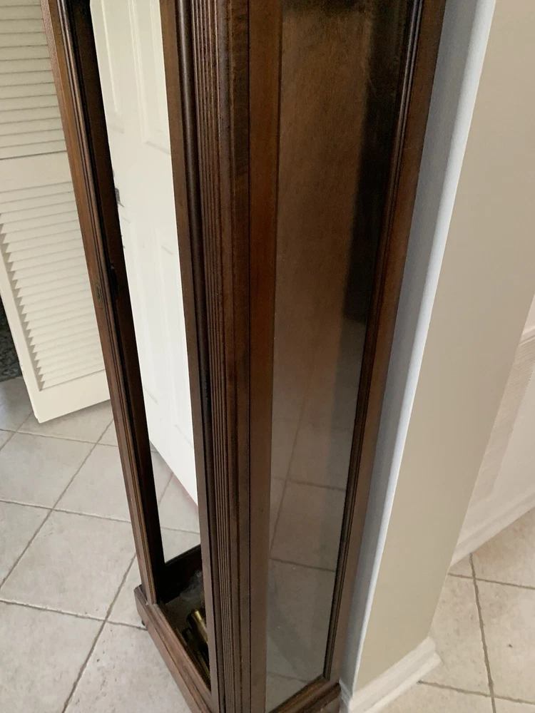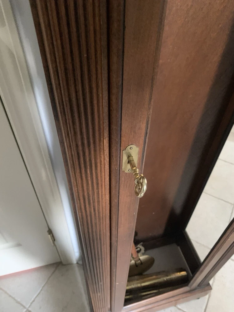 This antique-style longcase/grandfather clock by Howard Miller is a beautiful addition to any collection. Crafted from wood, it features a brown color that adds a touch of warmth to any room. The clock's design is inspired by the Tempus Fugit collection, known for its intricate details and timeless appeal. Ideal for collectors of decorative items, this clock is perfect for adding a touch of vintage charm to any space. Its brand, Howard Miller, is synonymous with quality and style. Whether you're looking for a unique piece to display or a functional clock to keep accurate time, this grandfather clock is sure to impress. Missing glass in front door Chimes have to be put back in. Clock works