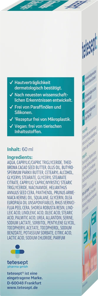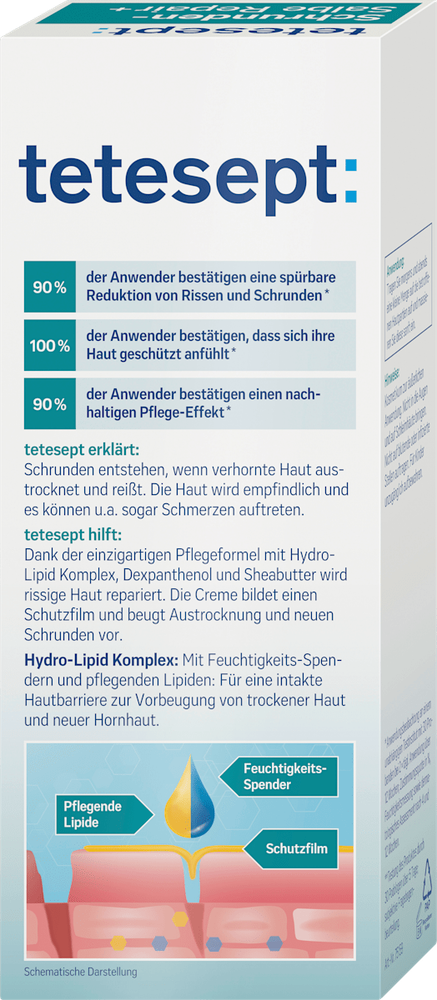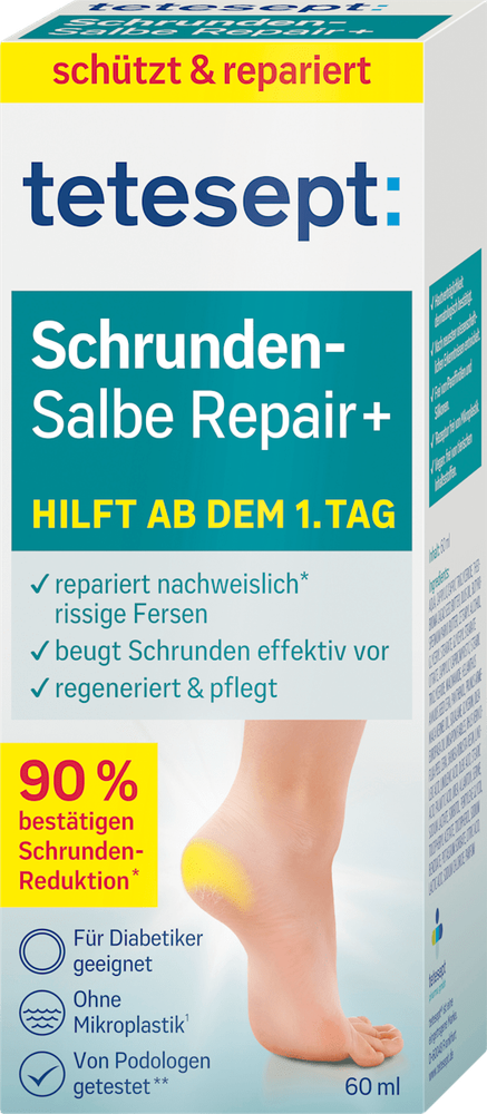 Schrundensalbe works quickly and effectively with a Hydro-Lipid Complex formula. The product is free from microplastics, water-soluble synthetic polymers, paraffins, silicones, and is not tested on animals, making it vegan. The ingredients include natural oils, butters, and plant extracts, such as shea butter, sunflower seed wax, and prunus armeniaca kernel oil. The formula is rich in essential fatty acids, vitamins, and antioxidants that help to nourish and protect the skin. Schrundensalbe is a quick and effective solution for dry and damaged skin. Its key use is to provide intensive care and protection to rough and cracked skin areas. The formula is based on a Hydro-Lipid Complex, which helps to restore the skin's natural barrier and retain moisture. The product is free from harmful ingredients, such as microplastics, paraffins, and silicones, and is not tested on animals. The ingredients include natural oils, butters, and plant extracts that are rich in essential fatty acids, vitamins, and antioxidants. These ingredients help to nourish and protect the skin, leaving it soft, smooth, and healthy. It is recommended to store the product out of reach of children.