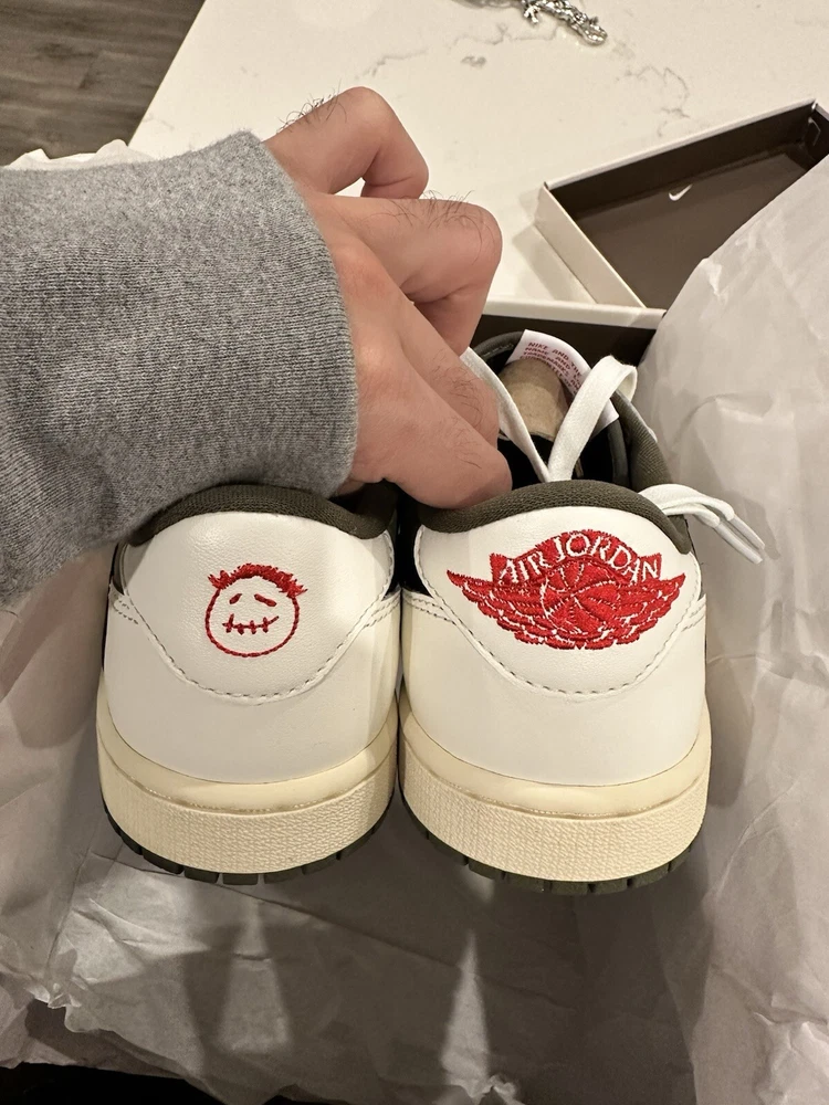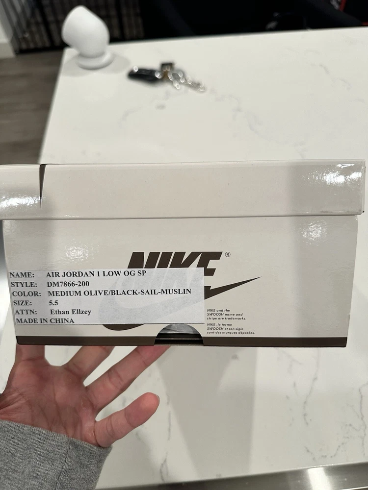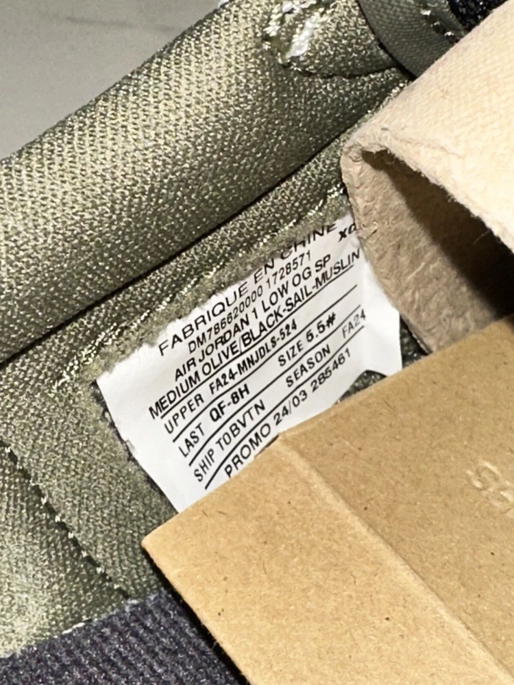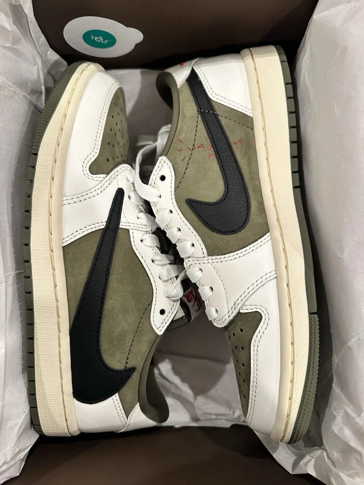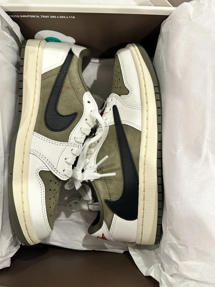 Travis Scott Jordan 1 low reverse Olive this is a promo shoe as shown on the tag. The sticker on the box is different as this is from the warehouse. Everything is authentic feel free the ask questions price is firm