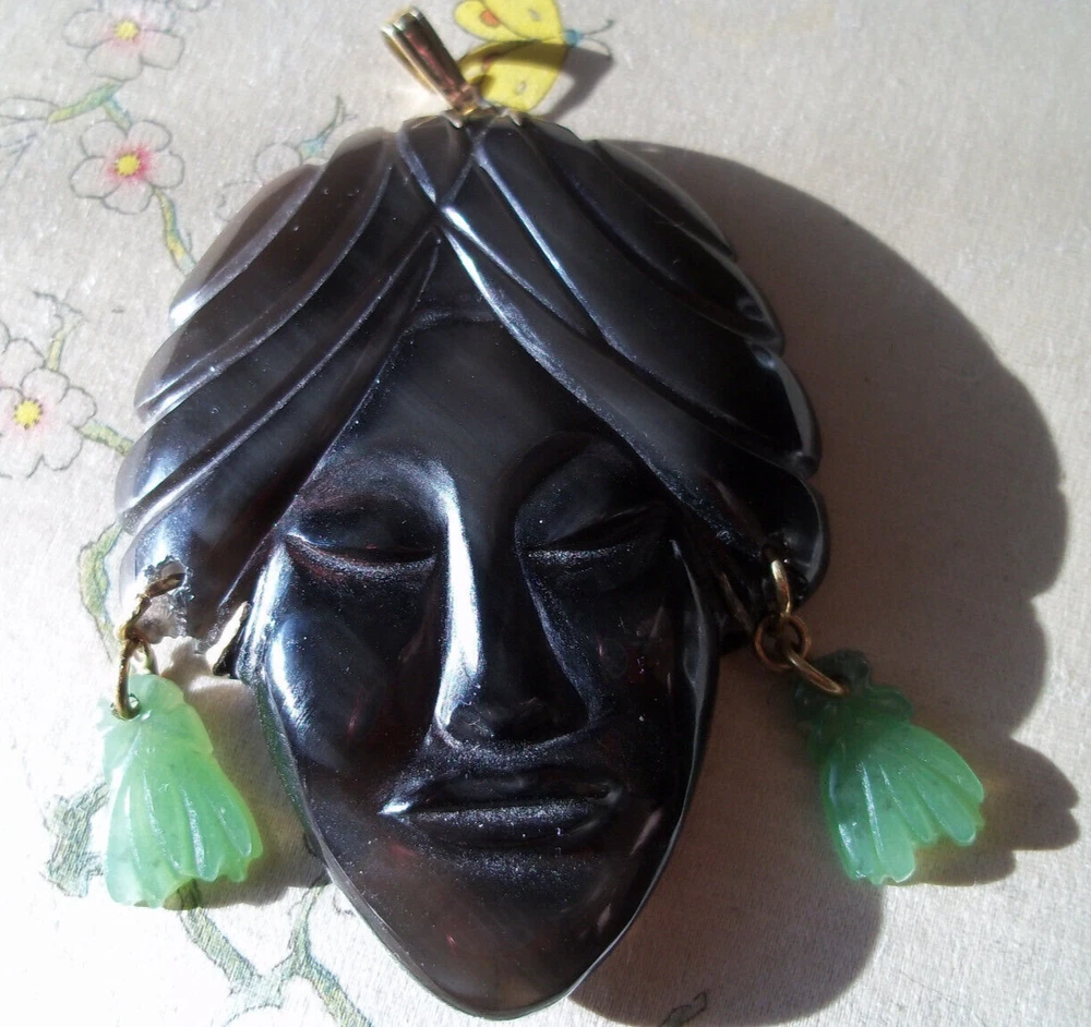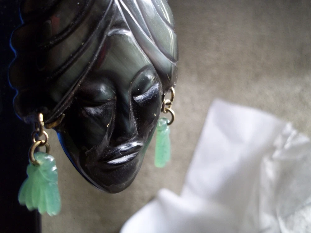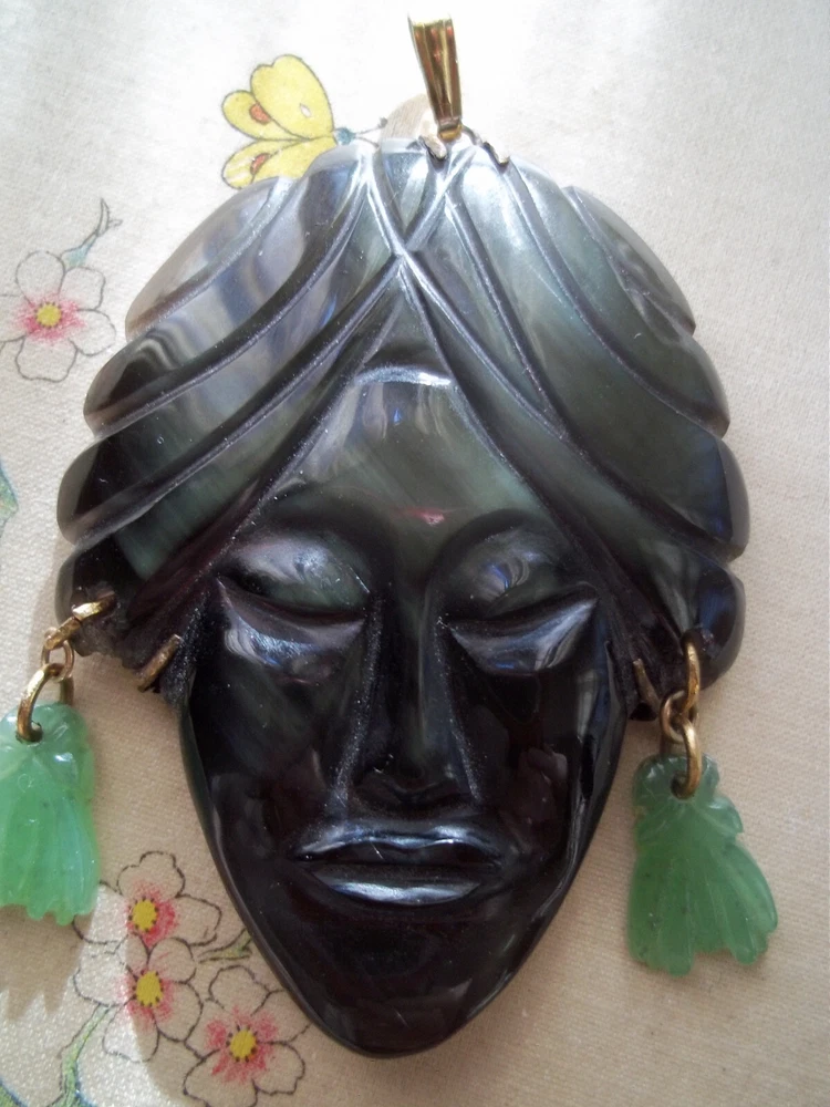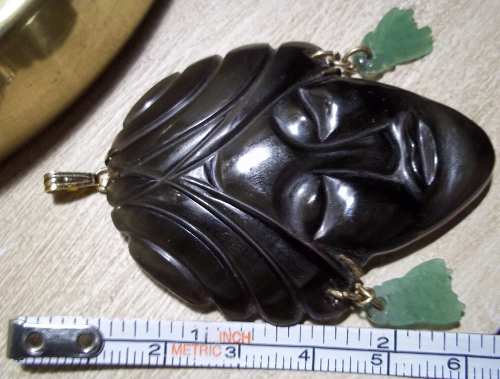 custom studio hand built jewelry. amazing color. large magnificent one of a kind ooak. ONE NOIR GODDESS FEMALE portrait custom hand made jewelry older PENDANT. LARGE SILKY CHATOYANCY OR SHEEN, SEE, NATURAL OBSIDIAN SHEEN SEE PICS SHE'S GORGEOUS. WITH JADES OR GREEN STONE CARVED EARRINGS. USED GREAT OLD PIECE ESTATE FIND MEXICAN HEAD FACE CARVING IN NATURAL GEMS LOOK DIFFERENT IN DIFFERENT LIGHT, SHOWN WITH LAMP AND IN NATURAL LIGHT HERE. SHE COMMANDS ATTENTION. FABULOUS THANK YOU FOR YOUR VIEW OR FOR KEEPING A SMALL BUSINESS THRIVING, AND DO HAVE A GREAT DAY OR NIGHT. INVENTORYKARMOIRED3
