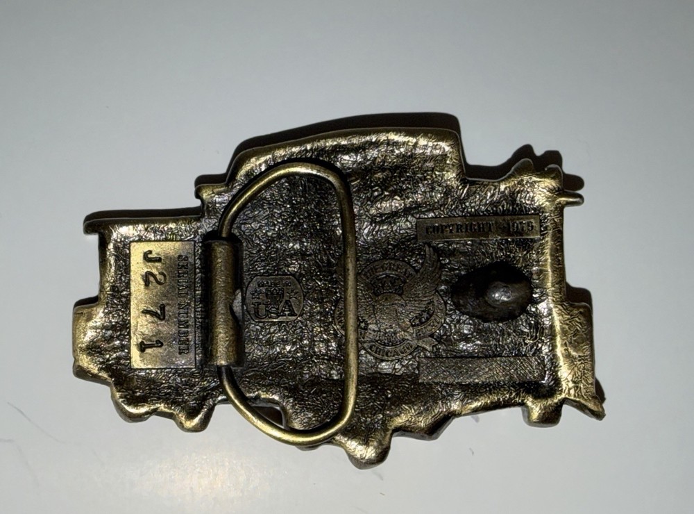 The vintage 1979 caboose train belt buckle by The Great American Buckle Company is a unique piece of American history. Made of metal in the 1970s, this original accessory features a themed design of vehicles/transportation, specifically a caboose train. Measuring for adult unisex wear, this belt buckle is a special vintage find that would make a great addition to any outfit or collection.