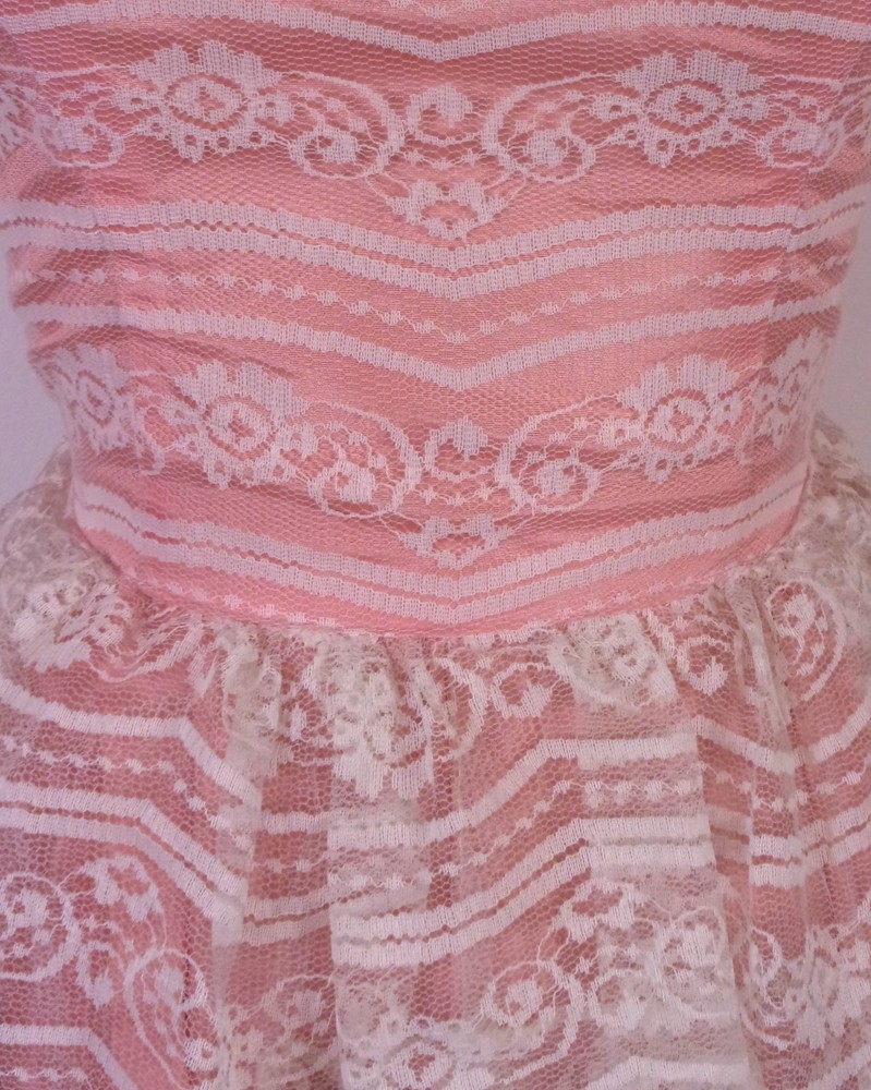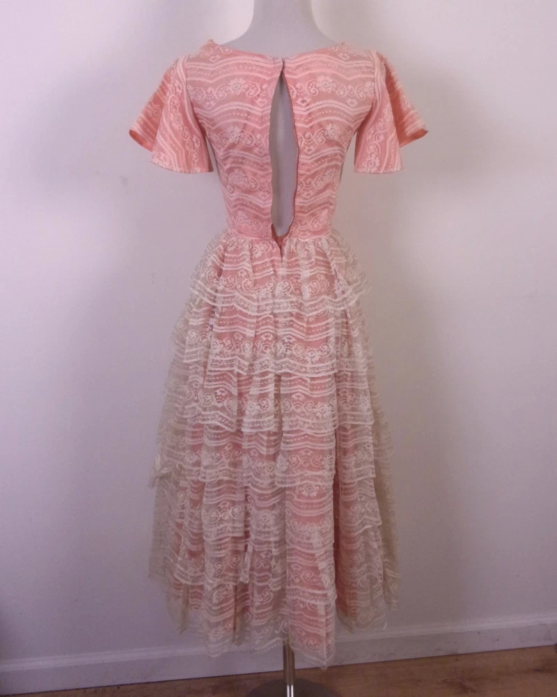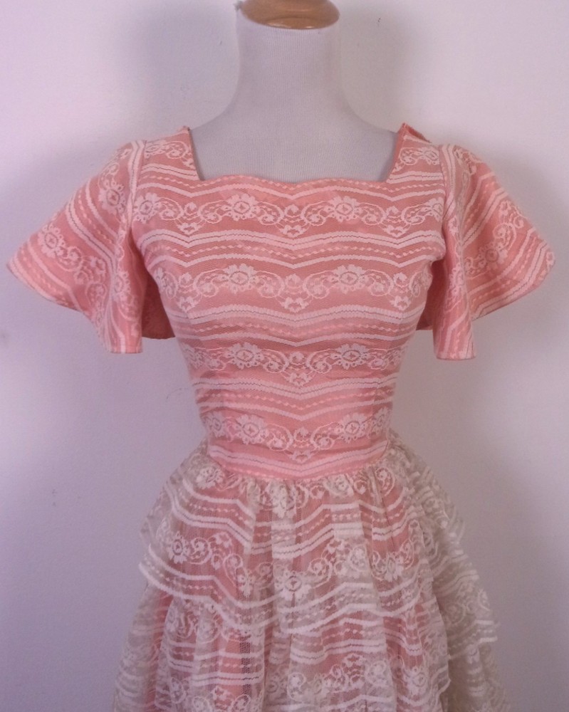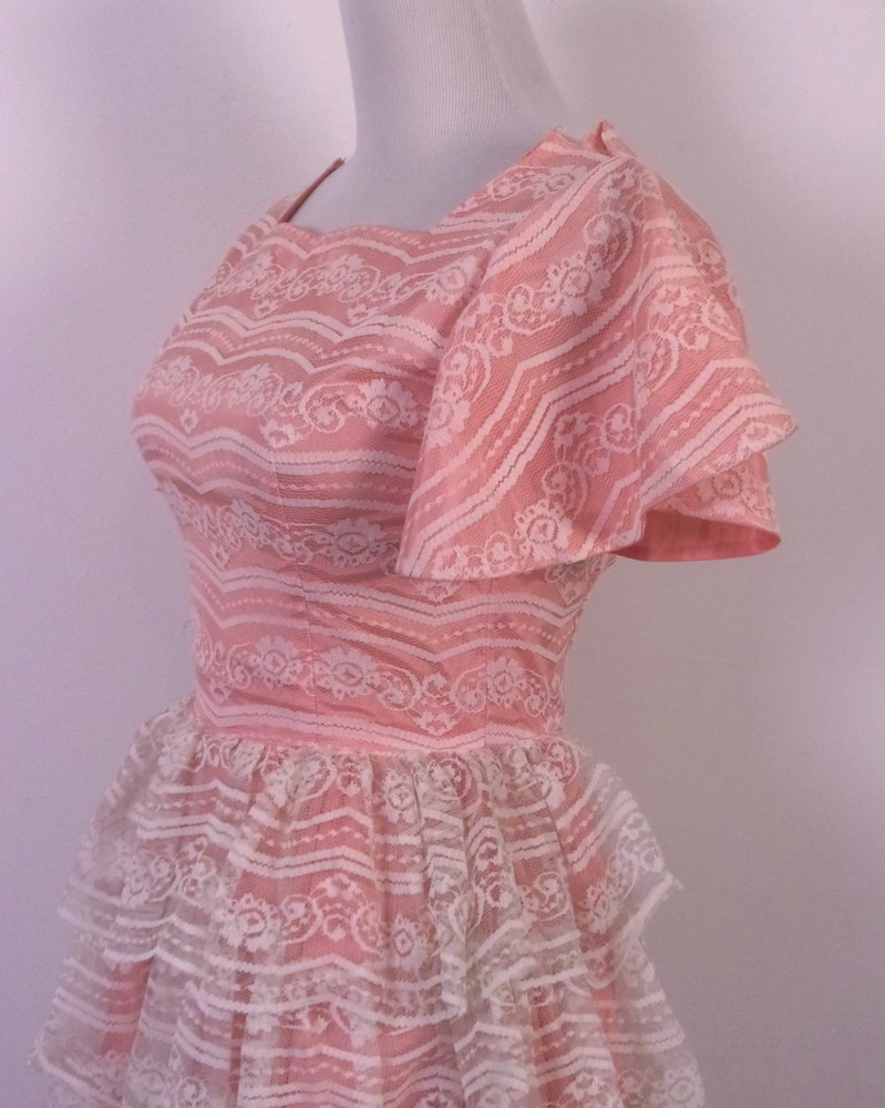 This vintage 50s 60s Tiered Lace Prom Dress in pink taffeta with ivory lace is perfect for formal occasions such as weddings, parties, or proms. The dress features a metal block letter TALON zip closure, short angel sleeves with a floral pattern, and a long length that exudes a retro vibe. Made in the United States, this dress is a timeless piece that embodies the style of the 50s and 60s with a touch of modern flair. Ideal for a cupcake-themed event or a rockabilly-inspired celebration, this dress is a must-have for any woman looking to make a statement at her next formal occasion. Wow - BEAUTIFUL true vintage late 50's/early 60's era party/prom/formal dress with tiered lace over pink taffeta, classic! It has one little seam split at the collar/shoulder, see pics. Just needs a quick little stitch to square it up there and boom, you'll have one heck of a crisp vintage classic. So nice. Has the older all caps/block print metal TALON zip down the back too. Bust: 31 Waist: 24 Hips: ~46 (pretty much open fit hips) Shoulders: 14.25 (seam to seam) Sleeves: 7 Total Length: ~45