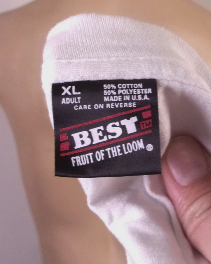 This vintage 80s 90s FOTL single stitch AFGE Union Yes T-Shirt in size XL features a graphic print design with a crew neck and short sleeves. Made of a cotton blend material, this white t-shirt from Fruit of the Loom Best is machine washable and has a regular fit. With a theme inspired by the 80s and 90s, this United States-made t-shirt is perfect for year-round wear in all seasons. Ideal for men who appreciate retro fashion and unique designs. Looks awesome! Beautiful clean condition with no flaws, looks likely unworn.