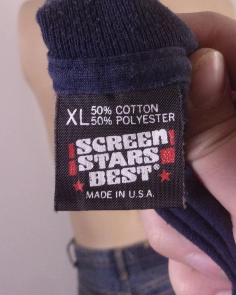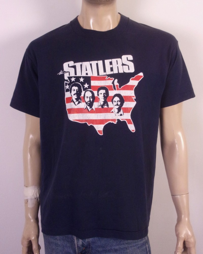 This vintage 80s 90s T-shirt features a graphic print of The Statler Brothers, a band popular in the 80s and 90s. It is a navy T-shirt with a crew neck and short sleeves, made of a cotton blend fabric. The T-shirt is in size XL and is of regular fit. It is a vintage item from the United States, perfect for fans of the band or music enthusiasts. Looks awesome! Great shape throughout, has only the most slight wear to the print, but very minor.