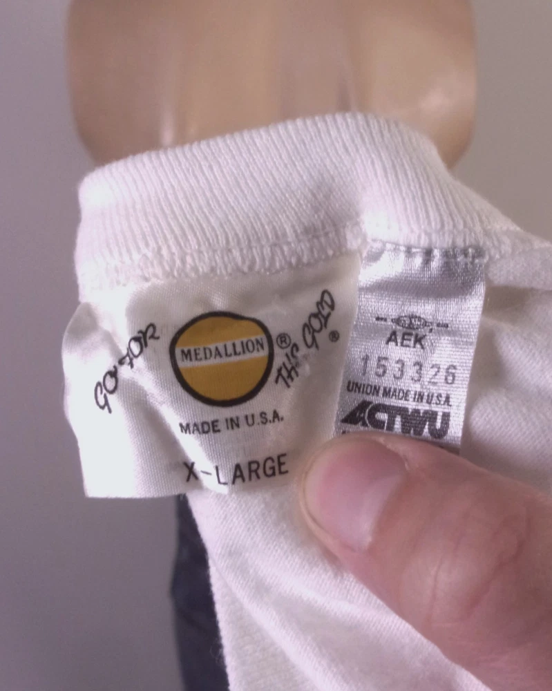 The vintage 80s Medallion USA single stitch AFGE Tomorrow's Union Today T-Shirt in XL size features a graphic print design with a crew neck and short sleeves. Made of cotton, this white T-shirt is machine washable and has a regular fit. Perfect for men, this retro shirt is themed around single stitch construction, union made apparel, and reflects the 80s and 90s era with its AFGE and union-inspired design. Ideal for all seasons, this United States-made garment is a unique addition to any collection of vintage clothing. Looks awesome! Beautiful clean condition with no flaws, true vintage single stitch and we have 3 of these (to start) in this graphic format, brand, and size, all single stitch originals.