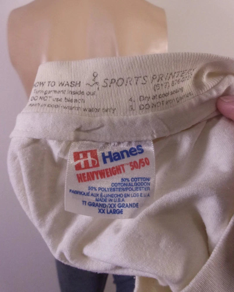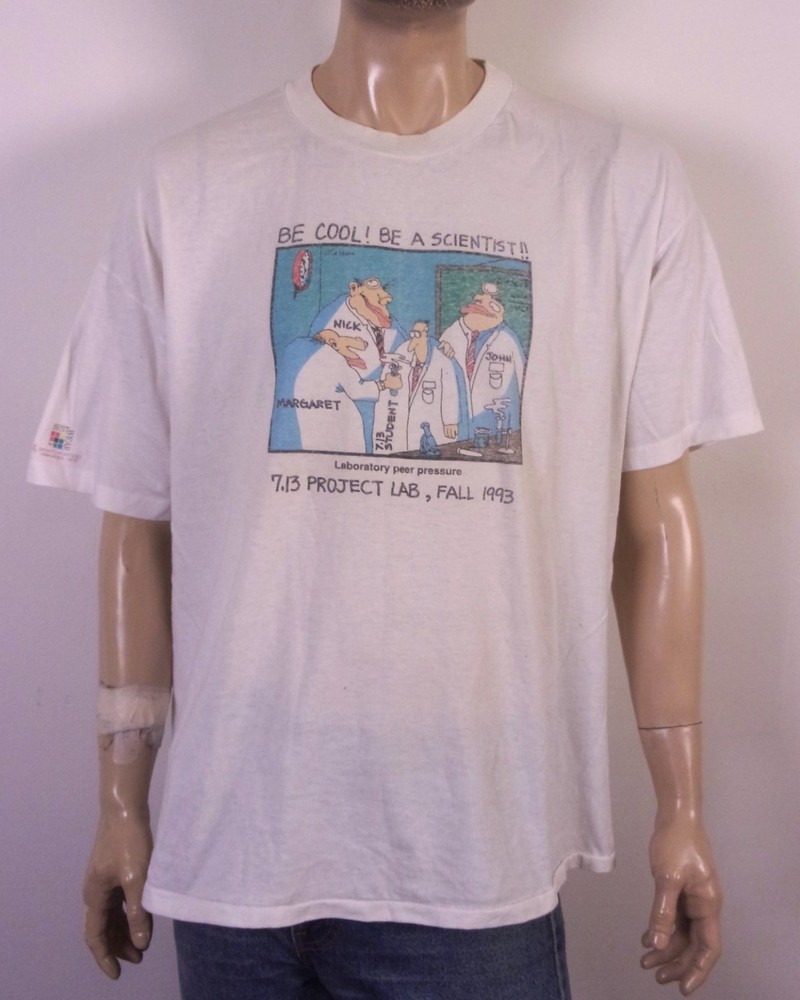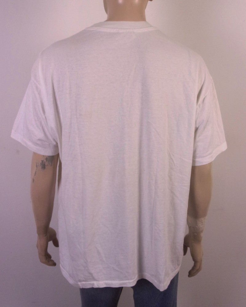 This vintage 80s single stitch Gary Larson The Far Side T-Shirt in XXL features a graphic print with a crew neck and short sleeves. Made from a cotton blend material, this white T-shirt is machine washable and has a regular fit. With a theme inspired by The Far Side comic strip, this shirt is perfect for fans of Gary Larson's work and those who appreciate retro 80s humor. Made in the United States by Hanes, this T-shirt captures the essence of the era and is a must-have for collectors and enthusiasts alike. Pit to Pit: 26 Length: 28.5