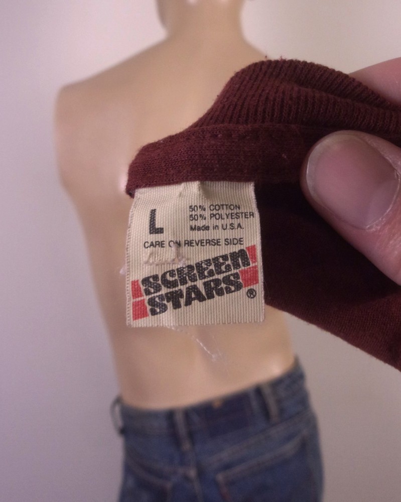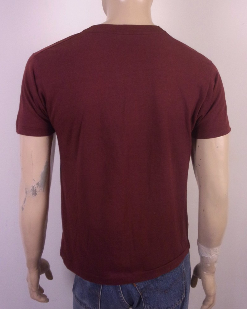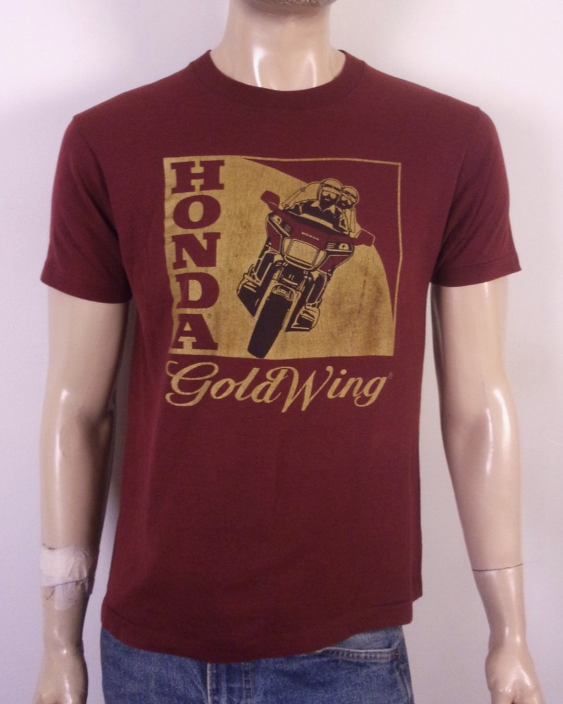 This vintage 80s single stitch Honda Goldwing Motorcycle T-Shirt is a must-have for any biker or motorcycle enthusiast. Made from a soft and thin cotton blend material, this maroon shirt features a graphic print design depicting a classic Honda Goldwing motorcycle. The regular fit, crew neckline, and short sleeves make it comfortable for year-round wear, while the retro 80s theme adds a nostalgic touch. Perfect for adding a unique and stylish piece to any wardrobe, this T-shirt is machine washable for easy care and maintenance. Made in the United States by Screen Stars, this shirt is a classic piece of men's clothing that celebrates the iconic Goldwing motorcycle. Pit to Pit: 20.5 Length: 25