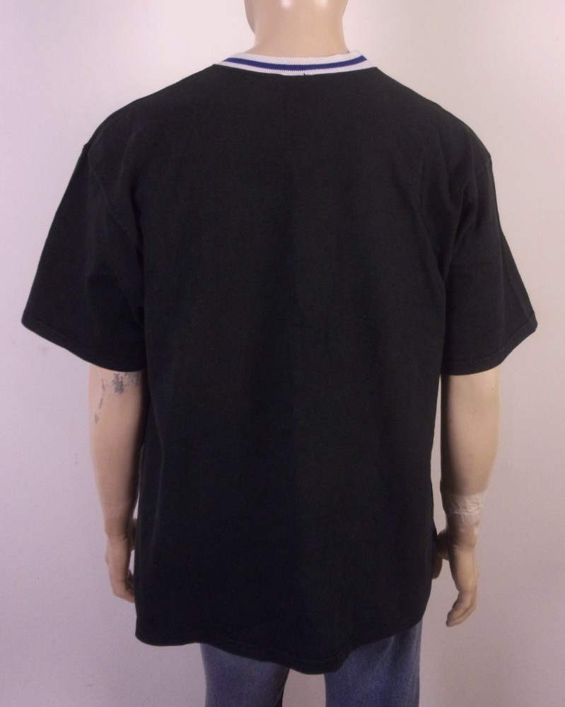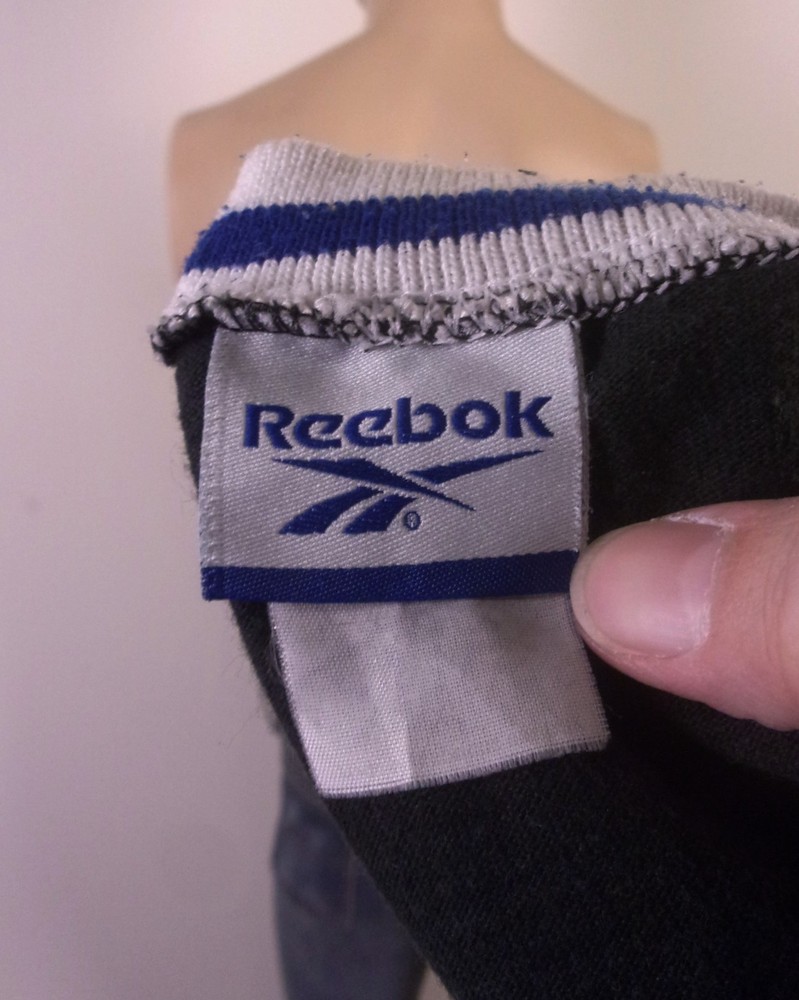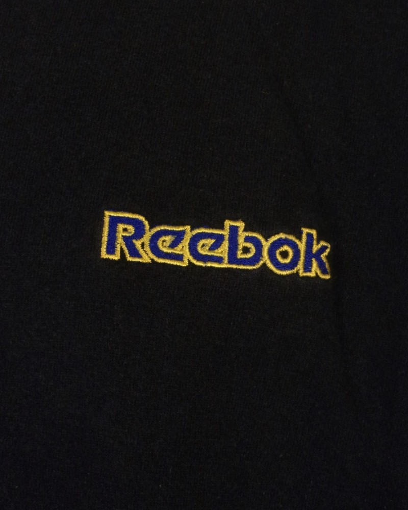 The vintage 90s Reebok Embroidered Spell Out Logo T-Shirt in size 2XL is a classic piece of men's clothing that embodies the style of the 90s era. The shirt features a regular fit with a ringer crew neckline and short sleeves, making it a comfortable and stylish option for casual wear. The black shirt with white and blue accents adds a pop of color and the spell out logo embroidery gives it a nostalgic touch. Perfect for those who appreciate retro fashion and quality brands like Reebok. Pit to Pit: 24.5 Length: 28.5