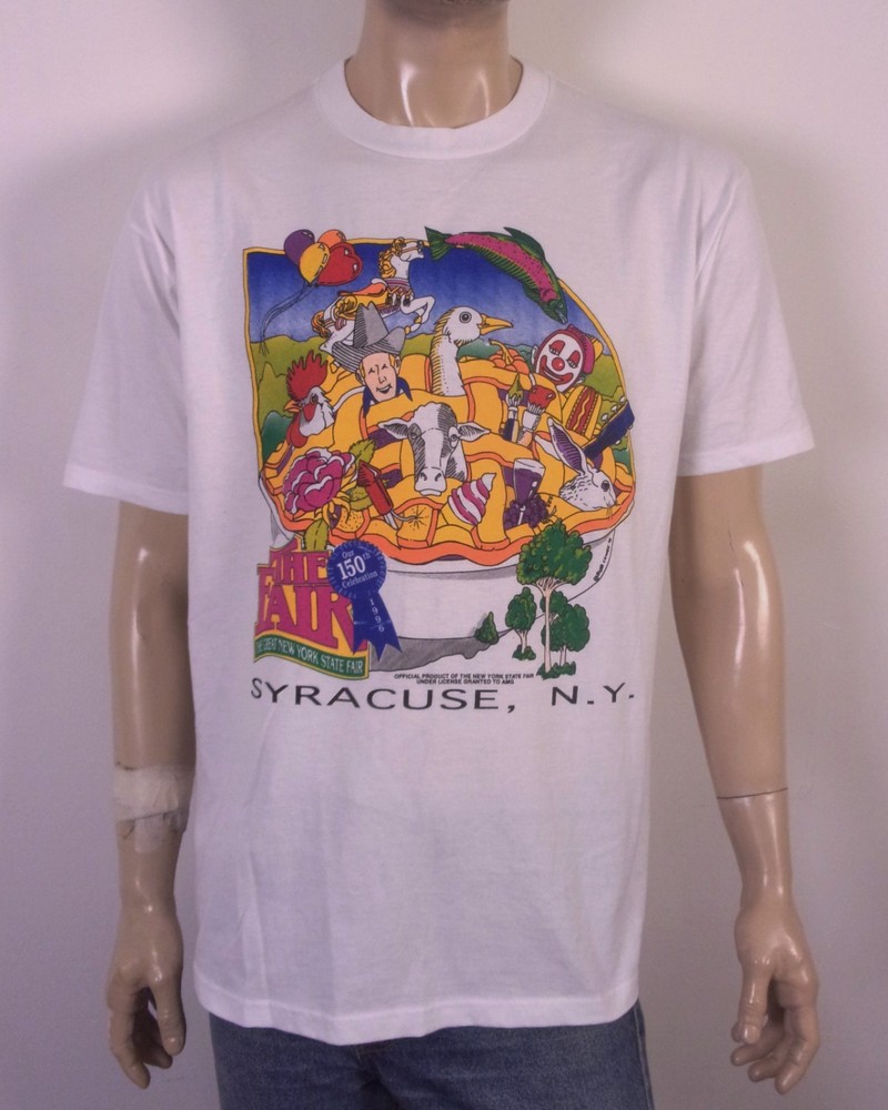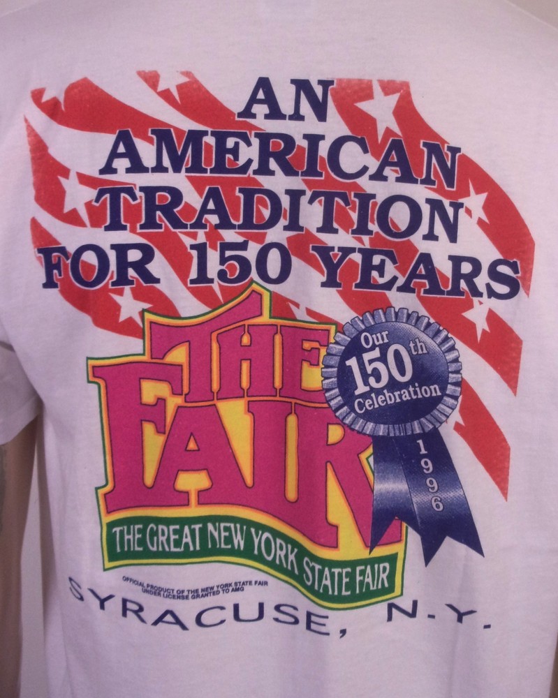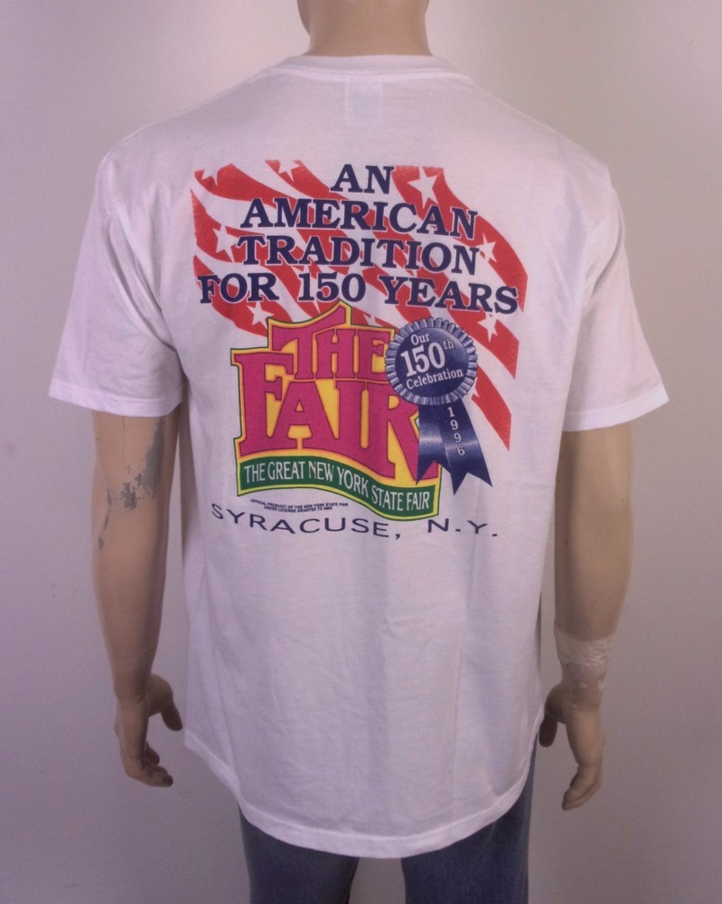 This vintage 90s Syracuse NY 1996 New York State Fair T-Shirt is a 2-sided graphic print shirt in size XL. Made from a comfortable cotton blend material, it features short sleeves, a crew neck neckline, and a regular fit. The shirt showcases a nostalgic theme from the 90s, specifically highlighting the New York State Fair in Syracuse NY in 1996. Perfect for all seasons, this machine washable white shirt is a must-have for any vintage clothing collector or fan of retro fashion. Pit to Pit: 22.5 Length: 29