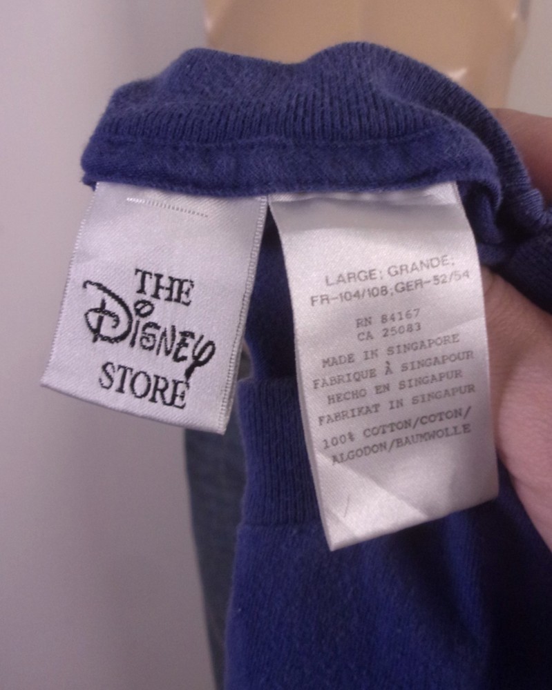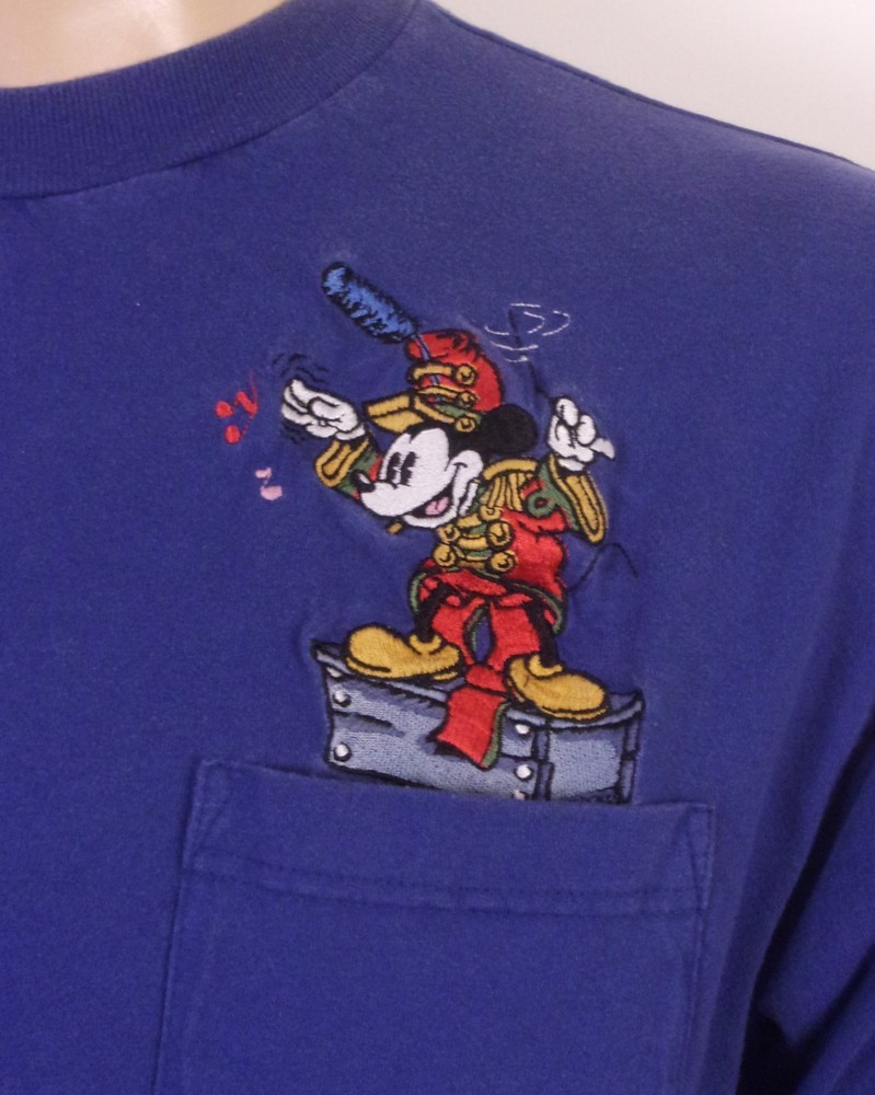 The vintage 90s The Disney Store Mickey Mouse Pocket T-Shirt is a nostalgic piece of clothing featuring an embroidered pocket with the iconic Mickey Mouse. Made of cotton in a classic blue color, this t-shirt is machine washable and has a crew neck and long sleeves. Perfect for any Disney fan or collector of 90s memorabilia, this regular fit shirt in size L is a great addition to any wardrobe. Ideal for year-round wear, this t-shirt captures the essence of the beloved Disney characters and styles from the 90s. Pit to Pit: 21.5 Sleeves: 22.5 Length: 26.5
