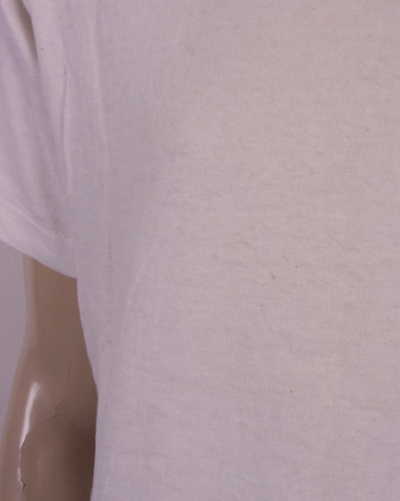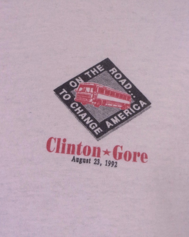 This vintage 90s single stitch Bill Clinton 1992 President Campaign T-Shirt in size L features a graphic print of the former President with themes from the political campaign. Made of cotton, this white T-shirt with a crew neck and short sleeves is machine washable and has a regular fit. Manufactured between 1990-1999 in the United States by Fruit of the Loom, this men's T-shirt is a unique piece of political memorabilia from the 90s, perfect for collectors or those interested in retro fashion. Pit to Pit: 21.5 Length: 25.5