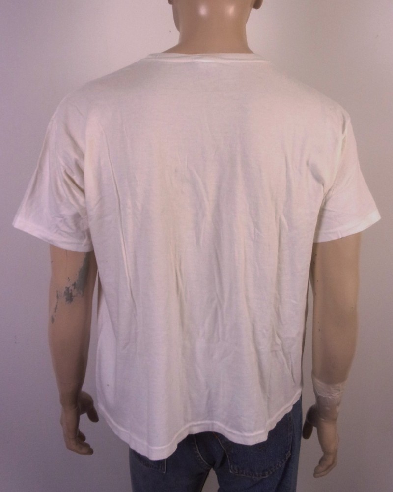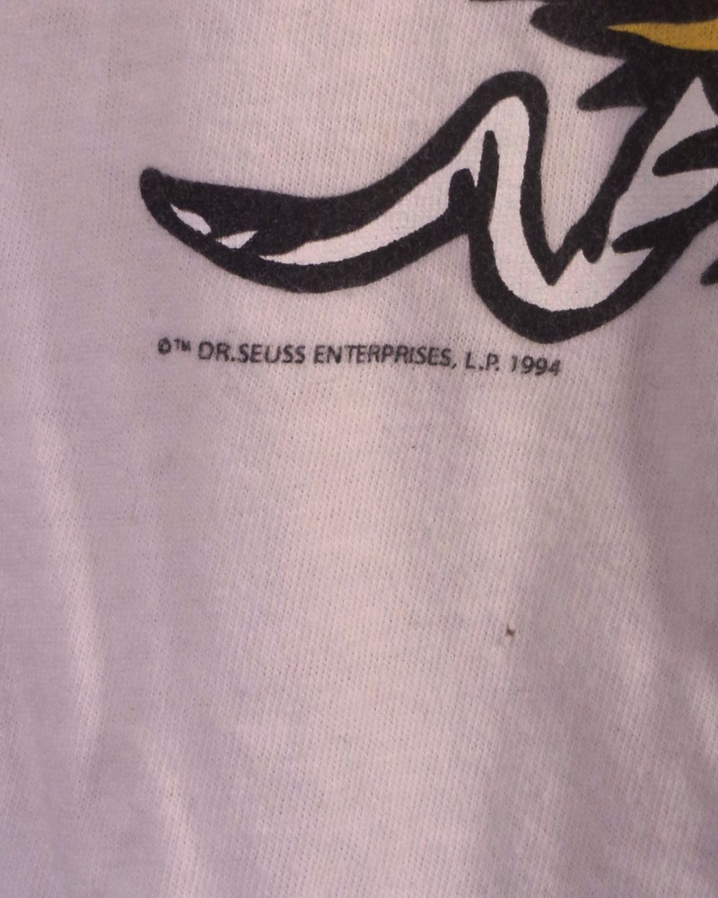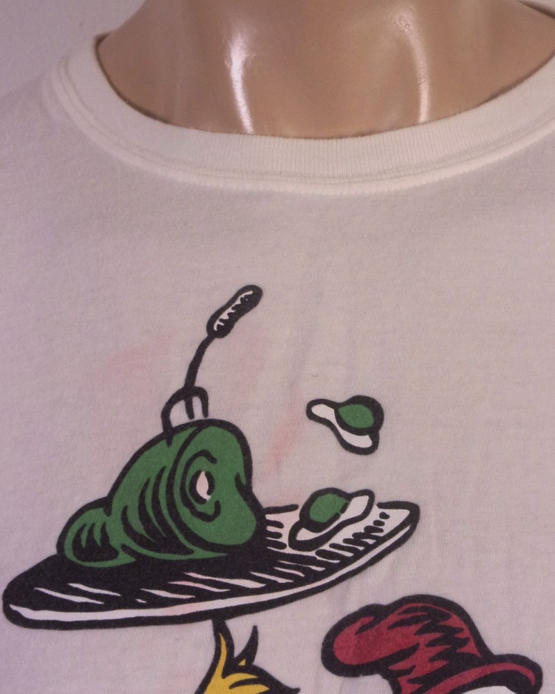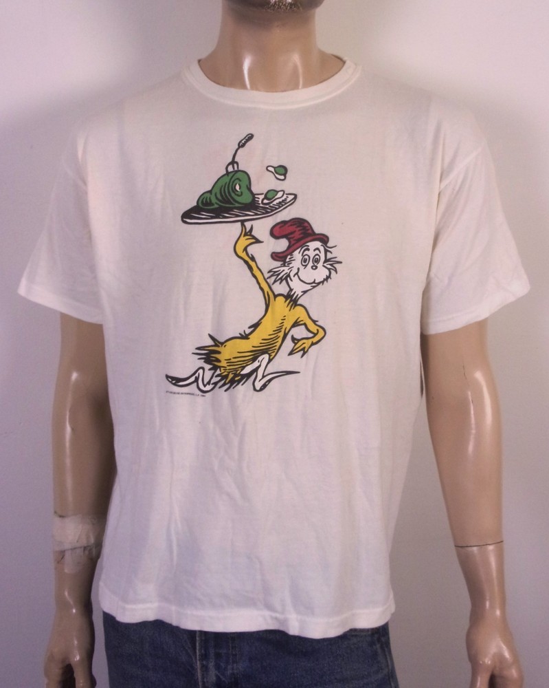 This vintage 90s Dr. Seuss T-shirt in size L features a graphic print of "Green Eggs & Ham" with a crew neck and short sleeves. Made of cotton and machine washable, this white shirt is a nostalgic piece from 1994, showcasing the iconic cartoon character and 90s theme. Perfect for fans of Dr. Seuss and collectors of retro clothing, this shirt is a unique addition to any wardrobe with its single stitch design and USA origin. Pit to Pit: 23 Length: 25.5