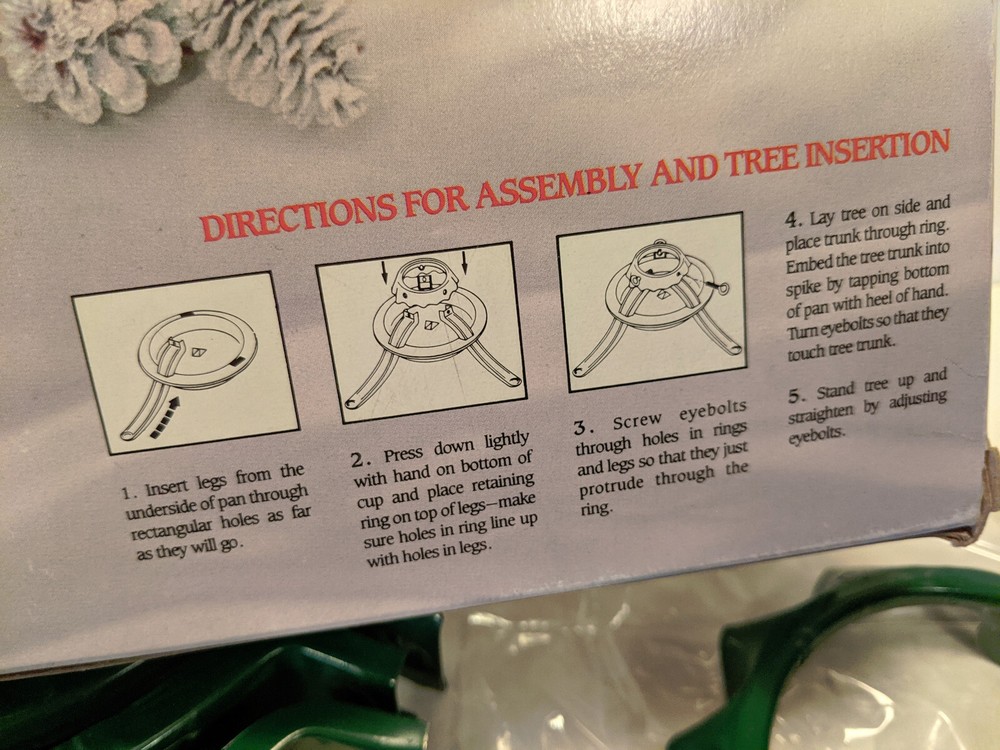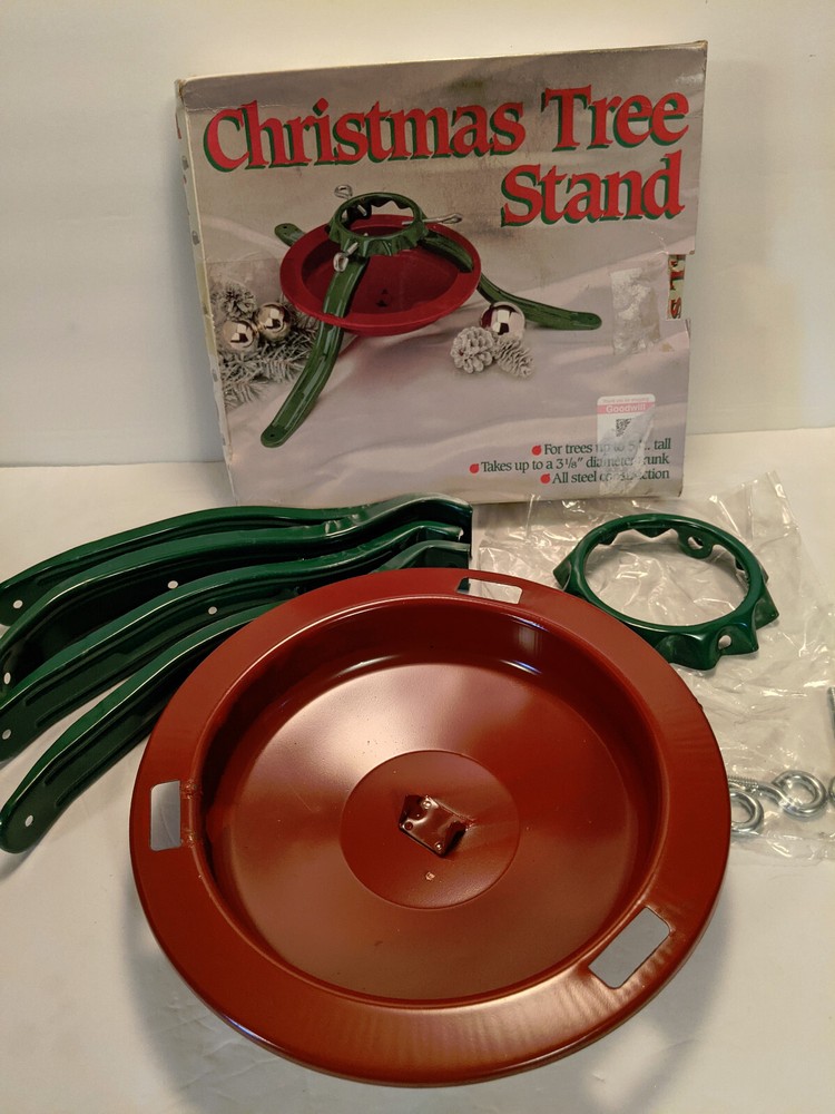 vintage METAL CHRISTMAS TREE STAND National Metal Industries Made in USA #5119 For trees up to 5 feet tall Takes up to a 3-1/8 inch diameter trunk All steel construction Red and green Lead free paint 20 inch leg spread for stability Bowl for holding water to keep your tree fresh throughout the season Instructions on the back of the box No tools needed for assembly