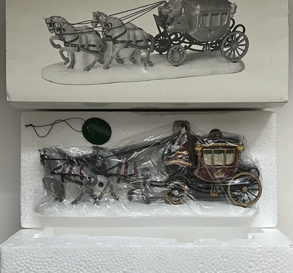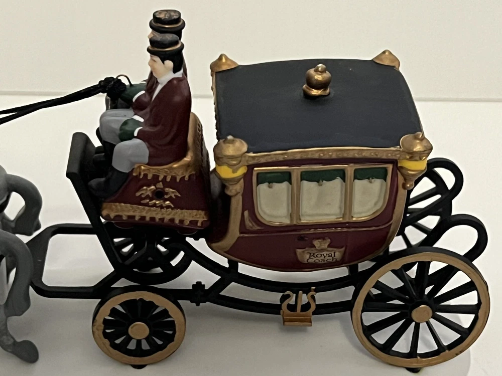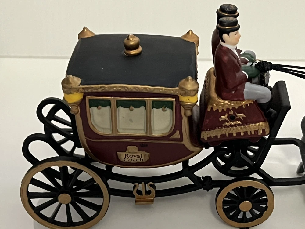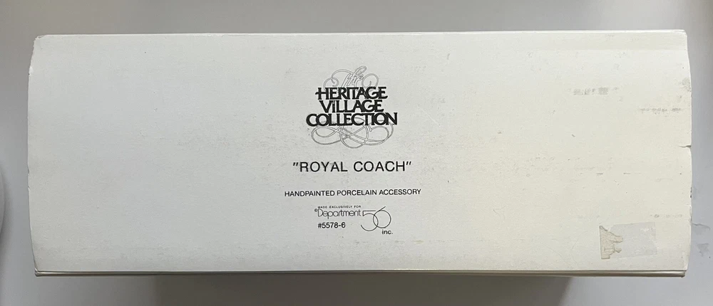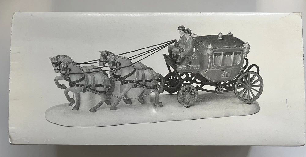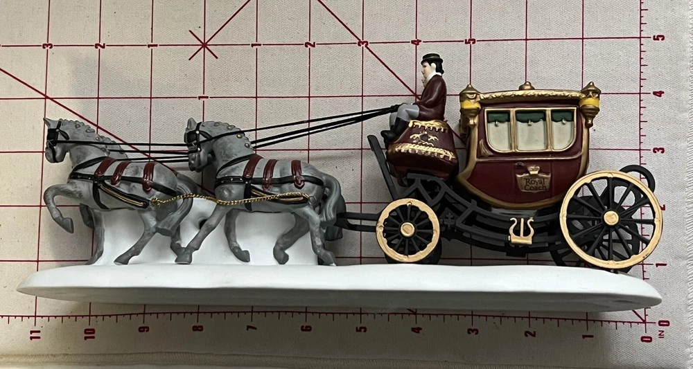 Listing for a 1989 Department 56 Dickens Village figurine ROYAL COACH featuring a Victorian coach with two coachmen and four gray horses pulling the coach. This figurine was retired in 1992. It is in mint condition with original box and packaging material. No chips or discoloration. The outer sleeve to the box has very little storage wear. It is approximately 11 inches wide and 5 inches tall. From my mom's large Dicken's Village collection and she was very particular when putting them away for storage. I will be listing from this collection daily. Thank you for checking it out. Shipped USPS Ground Advantage and shipping will automatically be combined with other items when placed in your cart