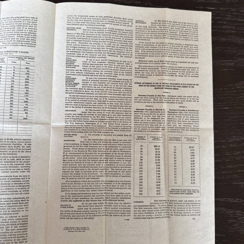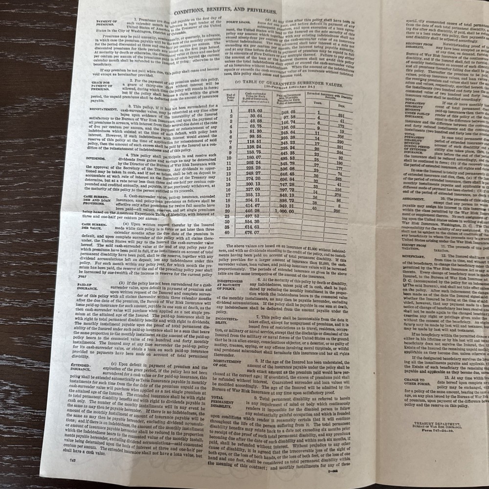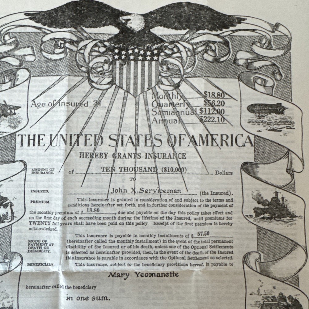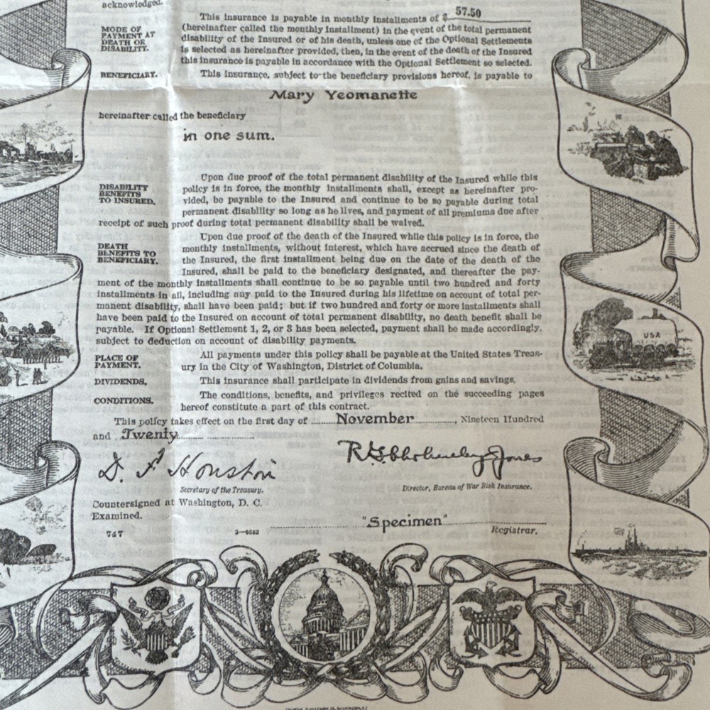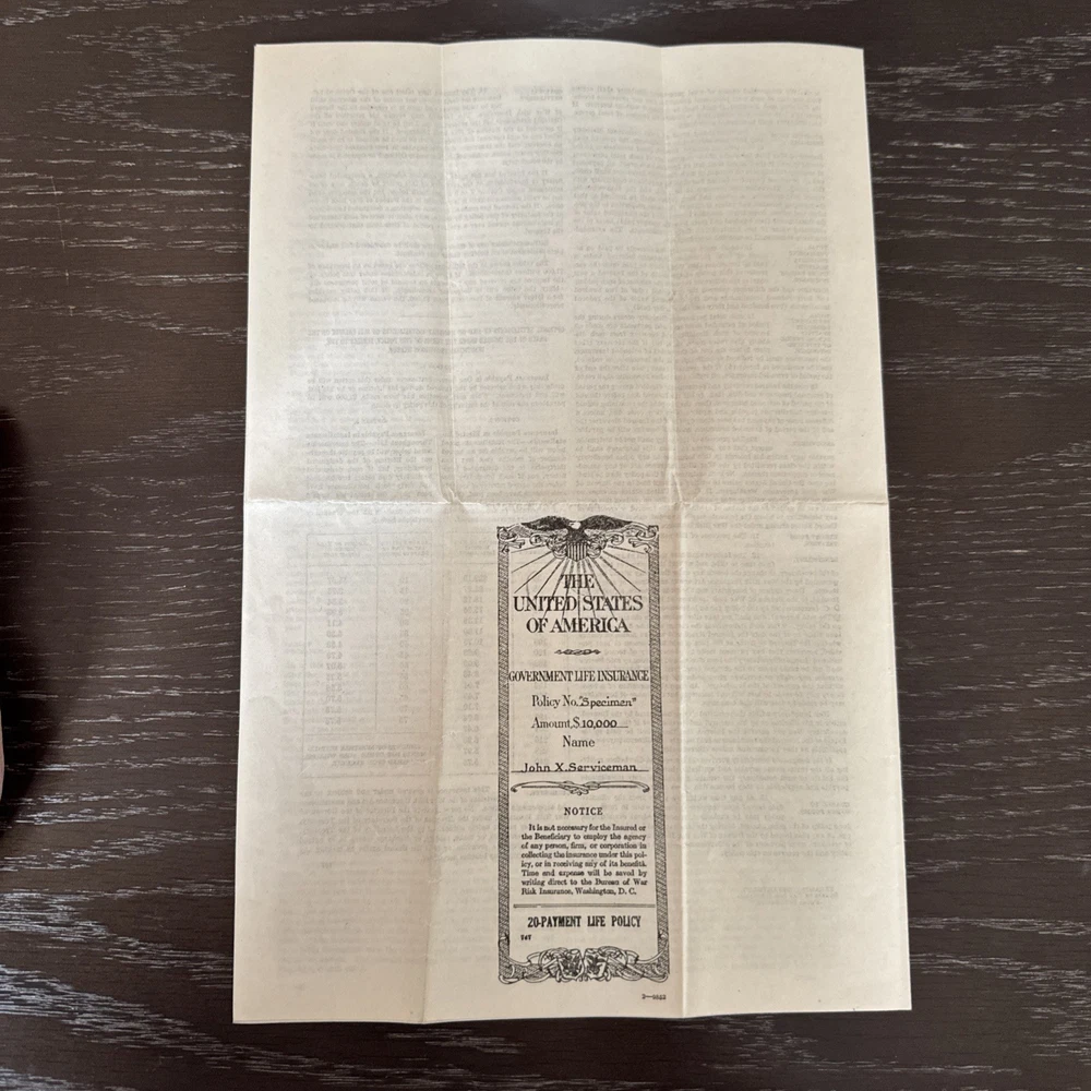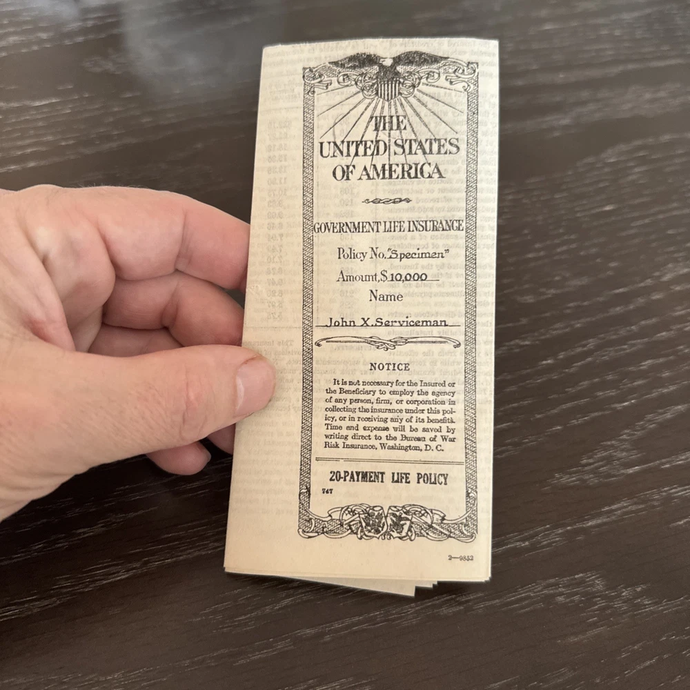 vintage United States Government Life Insurance Policy document 1920