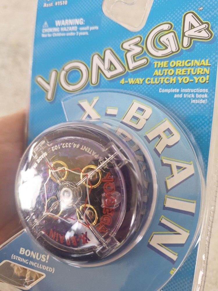 The vintage Yomega x-brain yoyo in purple is a classic toy from 1999, featuring the innovative design of Yomega. This yo-yo is known for its unique X-Brain shape and is a sought-after collectible item for toy enthusiasts. With its vibrant purple color and nostalgic appeal, this Yomega yoyo is sure to bring joy to both children and adults alike.