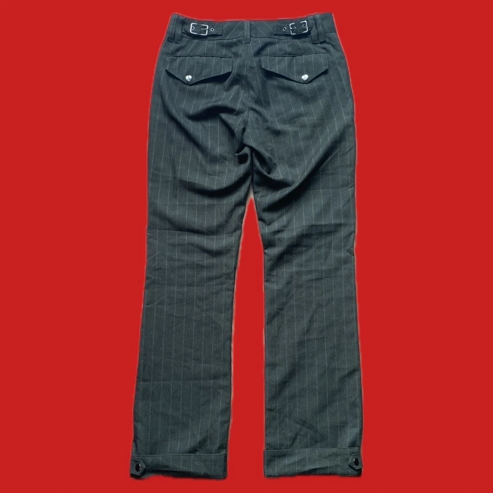 punk vintage lip service pinstripe pants !!!! these are so so good, in great condition - all the little details make this piece a statement for sure. the color is an off-grey, really unique :) marked a 28 but measured 30x31 🥀 #vintage #lipservice #goth #grunge #alternative morbid threads tripp nyc royal bones mallgoth new wave bondage hardware